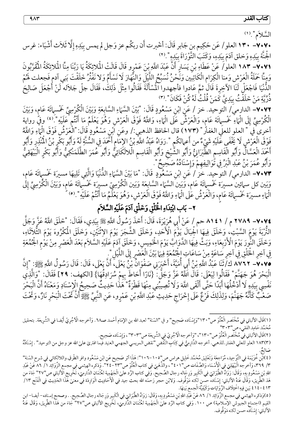 (¬٤) ابْن خُزَيْمَة فِي التَّوْحِيد، مُرَاجعَة وَتَعْلِيق مُحَمَّد خَلِيل هراس ص"١٠٥ - ١٠٦": هَذَا أثر صَحِيح عَن ابْن مَسْعُود وافر الطّرق. واللالكائي فِي شرح السّنة" ٣/ ٣٦٩، وَأخرجه الْبَيْهَقِيّ فِي الْأَسْمَاء وَالصِّفَات ص"٤٠١"، والذَّهَبِيّ فِي كتاب الْعُلُوّ ص"٢٣ - ٢٤". وَذكره الهيثمي فِي مجمع الزَّوَائِد ١/ ٨٦ عَنْ عَبْدِ اللَّهِ بْنِ مَسْعُودٍ بِهِ، وَقَالَ: رَوَاهُ الطَّبَرَانِيّ فِي الْكَبِير وَرِجَاله رجال الصَّحِيح. وَفِي كتاب الرَّد على الْجَهْمِية لعُثْمَان الدَّارمِيّ، تَخْرِيج الألباني ص"٢٧" جَاءَ من هَذ الطَّرِيق، وَقَالَ عَنهُ الألباني: إِسْنَاده حسن لكنه مَوْقُوف. وَلابْن حجر رَحمَه الله بحث جيد فِي الْأَحَادِيث الْوَارِدَة فِي معنى هَذَا الحَدِيث فِي الْفَتْح ١٣/ ٤١٣ - ٤١٤ بَين فِيهِ اخْتِلَاف الرِّوَايَات وَكَيْفِيَّة الْجمع بَينهَا.