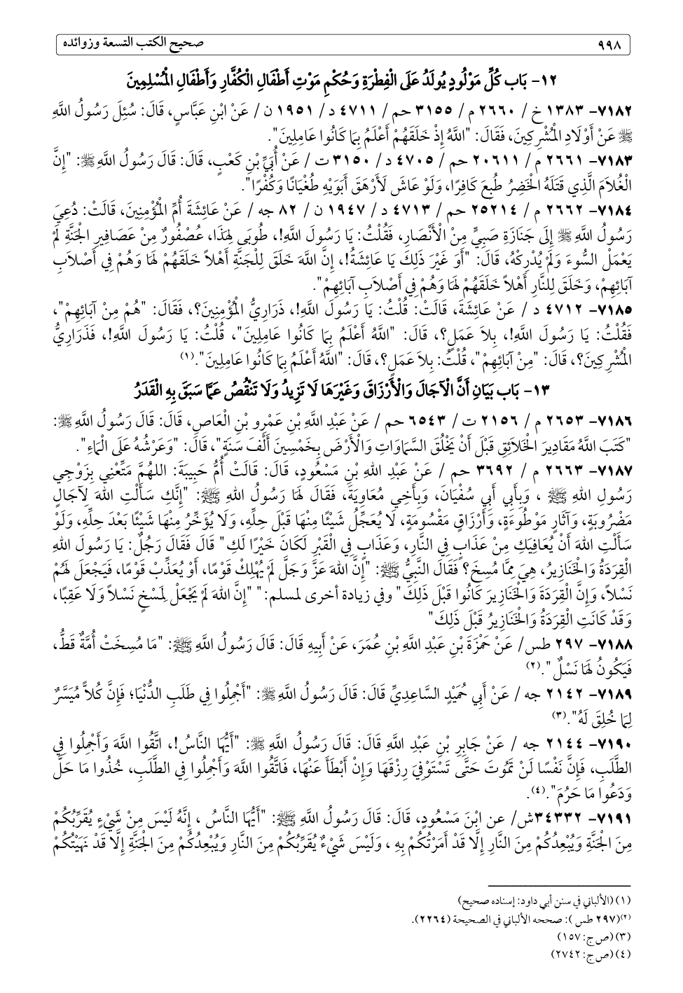 ٧١٨٤ - ٢٦٦٢ م / ٢٥٢١٤ حم / ٤٧١٣ د / ١٩٤٧ ن / ٨٢ جه / عَنْ عَائِشَةَ أُمِّ الْمُؤْمِنِينَ، قَالَتْ: دُعِيَ رَسُولُ اللَّهِ - صلى الله عليه وسلم - إِلَى جَنَازَةِ صَبِيٍّ مِنْ الْأَنْصَارِ، فَقُلْتُ: يَا رَسُولَ اللَّهِ!، طُوبَى لِهَذَا، عُصْفُورٌ مِنْ عَصَافِيرِ الْجَنَّةِ لَمْ يَعْمَلْ السُّوءَ وَلَمْ يُدْرِكْهُ، قَالَ: "أَوَ غَيْرَ ذَلِكَ يَا عَائِشَةُ!، إِنَّ اللَّهَ خَلَقَ لِلْجَنَّةِ أَهْلًا خَلَقَهُمْ لَهَا وَهُمْ فِي أَصْلَابِ آبَائِهِمْ، وَخَلَقَ لِلنَّارِ أَهْلًا خَلَقَهُمْ لَهَا وَهُمْ فِي أَصْلَابِ آبَائِهِمْ".