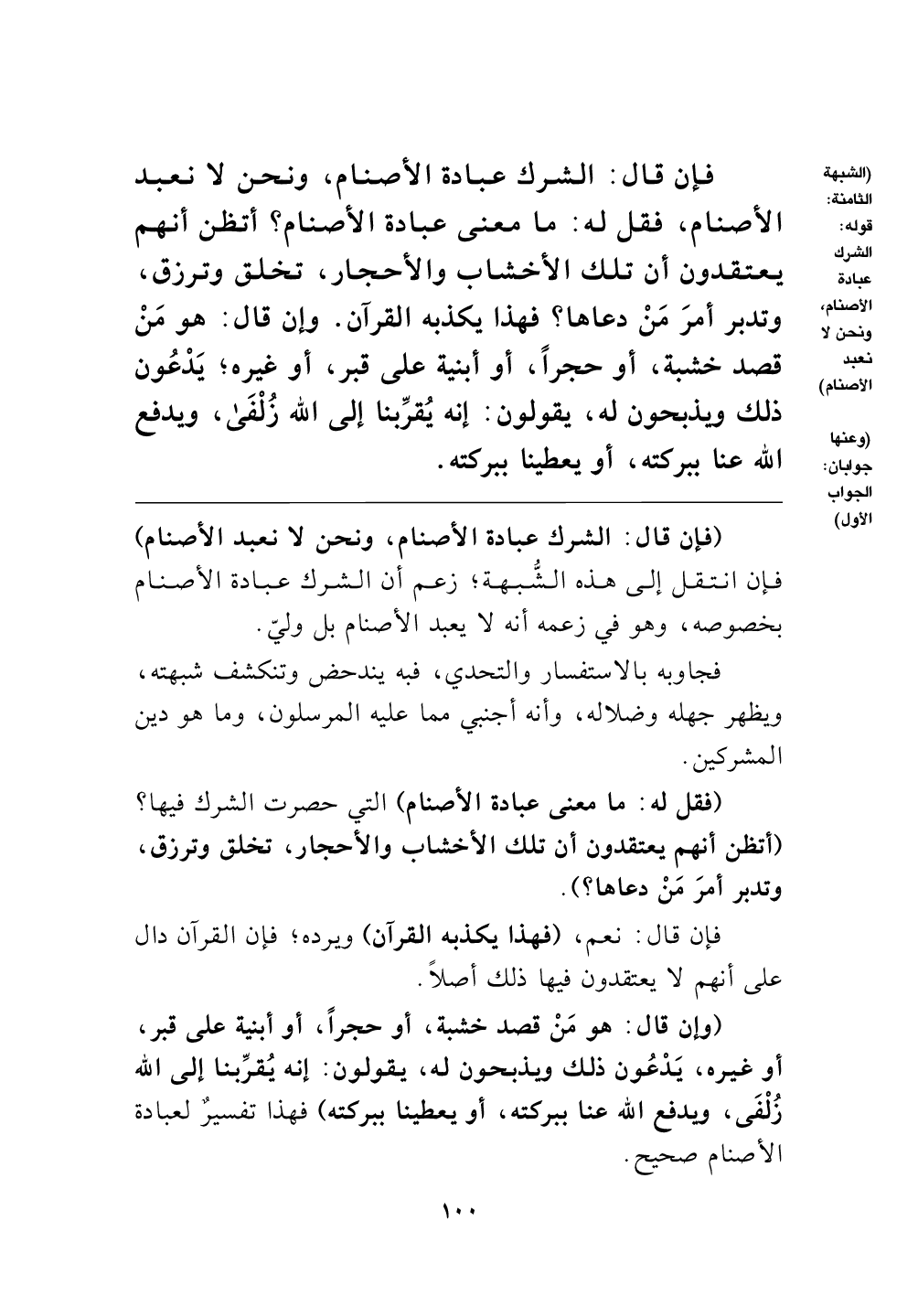 (ويقال أيضاً) هذا جواب خامس للشبهة السابقة (بنو عبيد القداح) الذين ادَّعَوا أنهم فاطميون وساعدهم على ذلك من ساعدهم وهم أدعياء ليسوا بفاطميين –أبوهم وقصة تزوّجه المرأة وتأريخهم معروف1 (الذين ملكوا المغرب ومصر في زمان بني العباس) وطالت لهم يَدٌ أيضاً على الحرمين؛ ملوكهم يُسمًّون الحاكميين؛ الحاكم فلان والحاكم فلان (كلهم يشهدون أن لا إله إلا الله وأن محمداً رسول الله ويدعون الإسلام ويصلون الجمعة والجماعة) وينصبون القضاة والمفتين (فلما أظهروا مخالفة الشريعة في أشياء دون ما نحن فيه) كاستحلال بعض المحرمات مثل تجويزهم الجمع بين الأختين (أجمع العلماء) في وقتهم (على كفرهم وقتالهم) ولا جعلوا الشهادتين والصلاة والزكاة والجمعة والجماعة فرقاً مؤثراً، بل رأوه لاغي