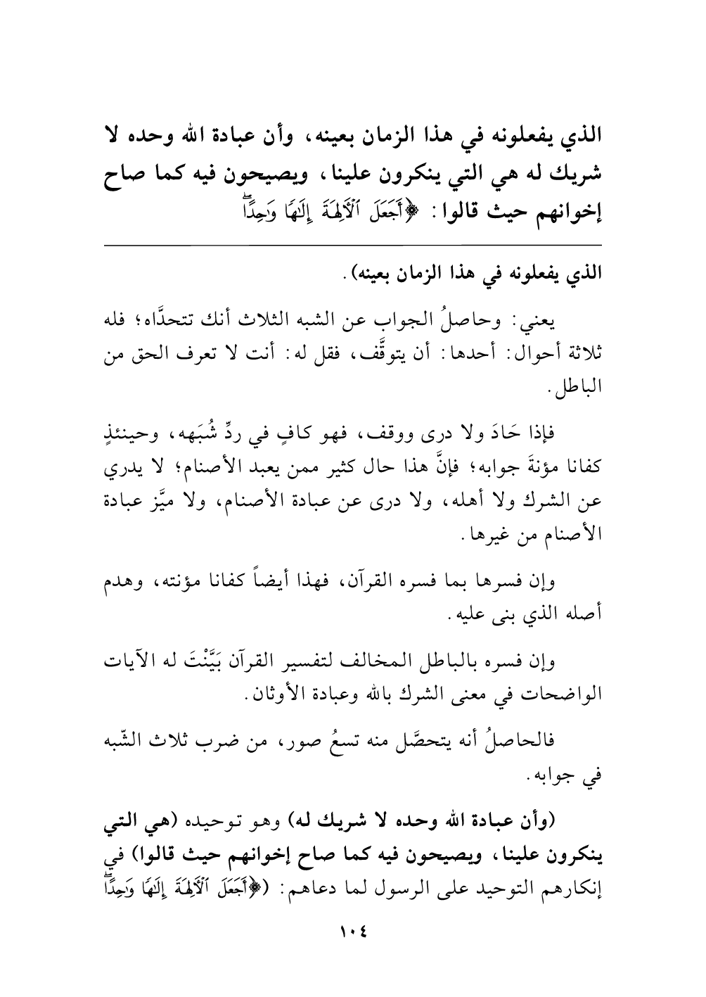 فتأمَّل هذه الشبهة، وهي قولهم: تكفِّرون من المسلمين أناساً يشهدون أن لا إله إلا الله ويصلون؛ ويصومون ثم تأمل جوابها؛ فإنه من أنفع ما في هذه الأوراق.