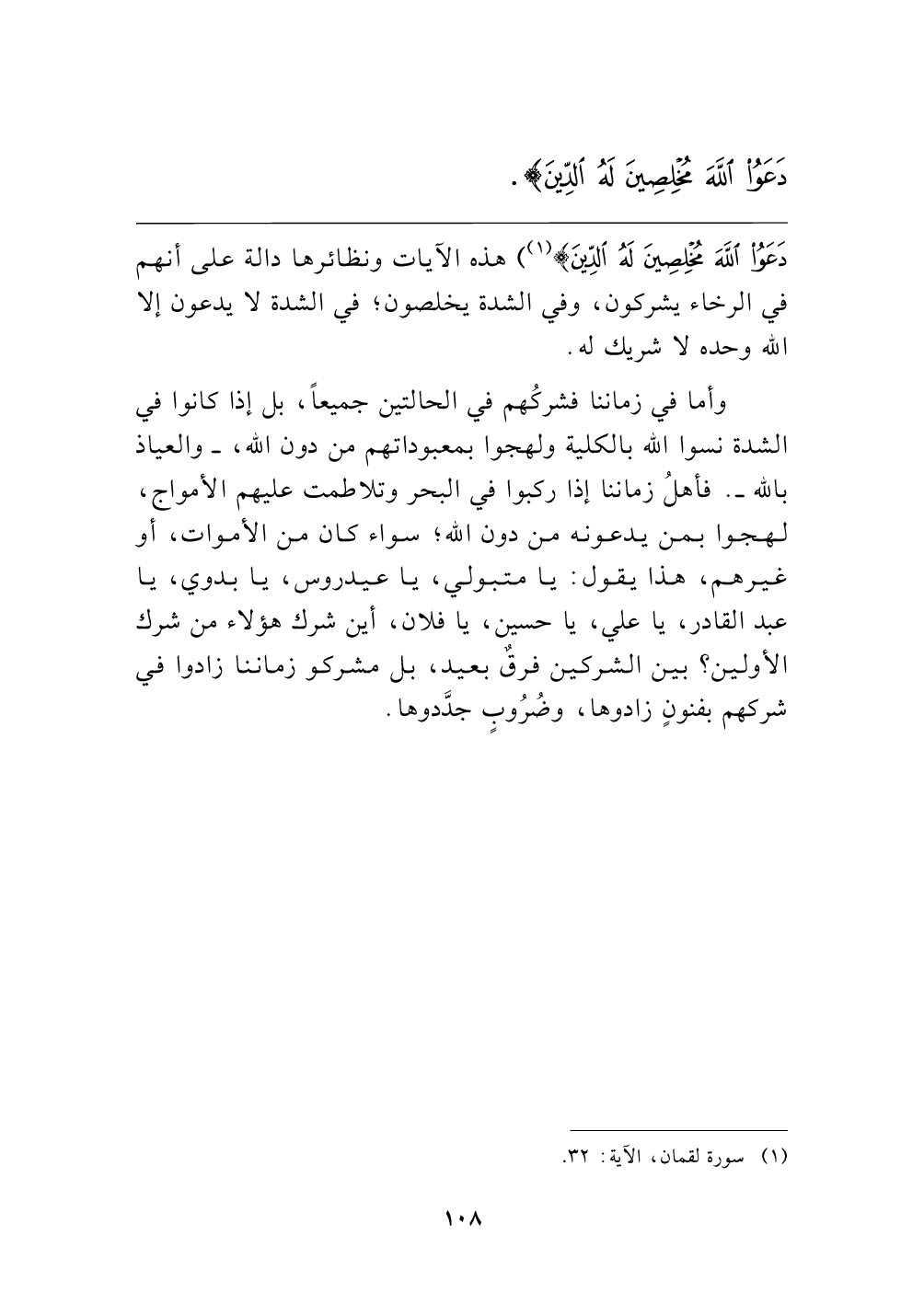 (والتحرز) يعني اتهام العمل أن يكون داخله شيء من الشرك؛ بل يجعل على باله هل أخلص قبل دخوله فيه، وتفقد النفس ولحظاتك فيمن هي (ومعرفة أن قول الجاهل التوحيد فهمناه أن هذا من أكبر الجهل ومكائد الشيطان) وهذه الكلمة قد صدرت من بعض الطلبة لما كثر التدريس في التوحيد متنه أو كتب نحوه سئموا وأرادوا القراءة في كتب أخرى. وقيل إنه من المرسلين؛ فنقم عليه المصنف في هذا القول؛ يعني أنك ما فهمته حتى الآن؛ فقال الشيخ رحمه الله ذلك لينبههم. ففي هذه القصة الرد عليهم فإن هؤلاء أهل علم وصدر منهم ما صدر. فلا يزهد في التوحيد فإن بالزهد فيه يقع في ضده، وما هلك من هلك ممن يدعي الإسلام إلا بعدم إعطائه