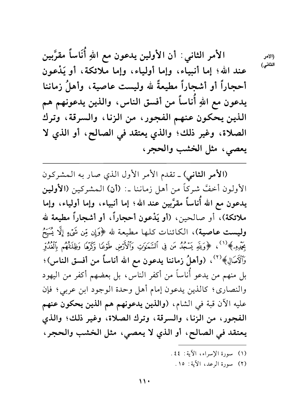(ومراد هؤلاء الجهلة) من إيراد هذه الأحاديث والتشبيه بها (أن من قال لا إله إلا الله لا يكفر ولا يقتل ولو فعل ما فعل!) يعني أن النطق بها كافٍ في إسلام العبد. ومرادهم أنكم معشر الموحدين تكفِّرون من يشهد أن لا إله إلا الله ... إلخ. وهذا من عظيم جهلهم وعمايِتهم؛ يرون أن الدين رسومٌ فقط، ما دَرَوا أن لها أرواحاً ومعانيَ؛ لها معاني هي المرادة، الألفاظ قوالبُ جثة والمعاني روح. ويأتيك كشفها ومراد النبي صلى الله عليه وسلم من هذه الأحاديث وأنه لا كما ظنوا وزعموا.