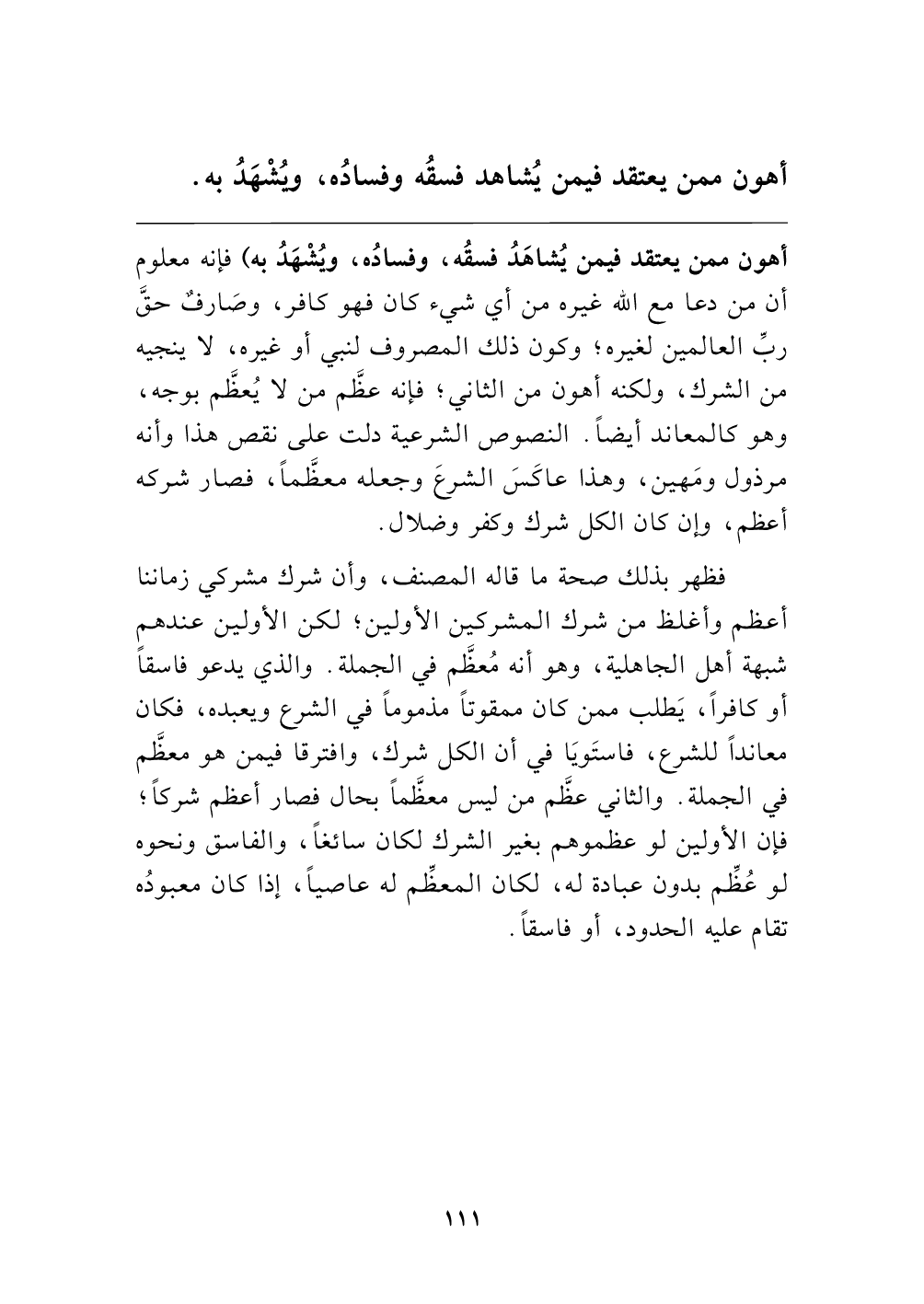 (فيقال لهؤلاء المشركين الجهال) في الجواب عن ذلك (معلوم أن رسول الله صلى الله عليه وسلم قاتل اليهود) في عدة مواطن (وسباهم) أخذ نساءهم مماليكَ وعبيدَ كالصنيع بسائر الكفار (وهم يقولون لا إله إلا الله) فلا منع قولُ لا إله إلا الله من قتالهم وسبيهم؛ فدل على أن مجرد قول لا إله إلا الله لا يمنع من التكفير، بل يقولها ناس كثير ويكونون كفاراًَ: إما لعدم العلم بها، أو العمل بها، أو وجود ما ينافيها. فلابد مع النطق بها من أشياء أخر؛ أكبرها معرفة معناها والعمل به.