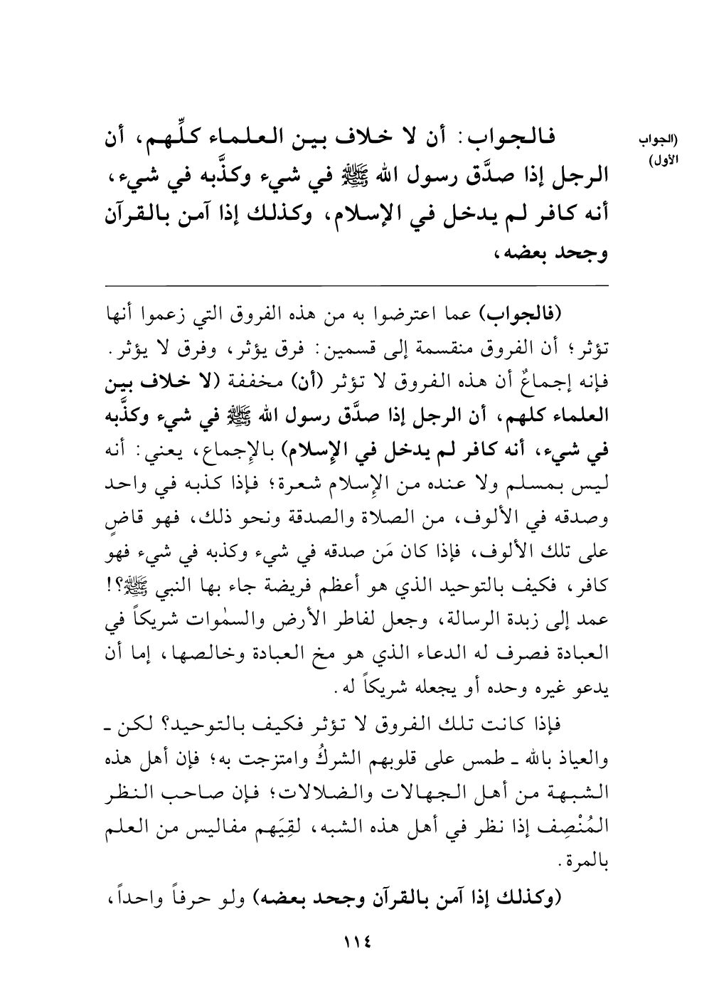 لا إله إلا الله (فإنه قتل رجلاً ادعى الإسلام بسبب أنه ظن أنه ما ادعاه إلا خوفاً على دمه وماله، والرجل إذا أظهر الإسلام وجب الكف عنه حتى يتبين منه ما يخالف ذلك) يعني والحكم الشرعي أنه لا يُقتَل ويجب الكف عنه ما دام في حالةٍ يحتمل أن يكون صادقاً ويحتمل أن يكون كاذباً حتى يتبين منه ما يخالف ذلك (وأنزل الله في ذلك: {يَا أَيُّهَا الَّذِينَ آمَنُوا إِذَا ضَرَبْتُمْ فِي سَبِيلِ اللَّهِ فَتَبَيَّنُوا} 1 أي: فتثبَّتوا. فالآية تدل على أنه يجب الكف عنه والتثبت) وهو التأني والنظر إلى ما يصير إليه آخر الأمر (فإن تبين منه بعد ذلك ما يخالف الإسلام قتل لقوله {فَتَبَيَّنُوا} ولو كان لا يقتل إذا قالها لم يكن للتثبت معنى) وليس المراد أنه يكف عنه مطلقاً. الناطق بالإسلام إن قامت القرائن أنه إنما قال ذلك ليسلم من القتل فإنها تدوم عصمته حتى يتبين منه ما يخالف ذلك، فإن تبين منه ما يخالف ذلك قُتل.