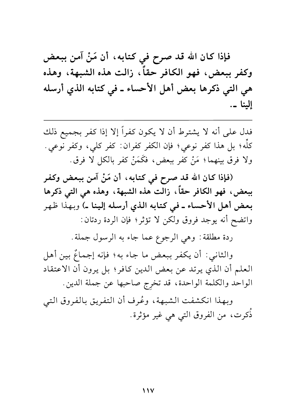 فليس مراده من "أقتلته بعد ما قال لا إله إلا الله؟ " وقوله: "أمرت أن أقاتل الناس حتى يقولوا لا إله إلا الله" وأحاديث أخر في الكف عمن قالها كما استدلوا به هنا؛ بل مراده صلى الله عليه وسلم أن من كان قبل على الكفر ثم أسلم فإنه يُكفُّ عنه كفَّ انتظار، ولو أنه يحتمل. فالحكم الشرعي أنه يكف عنه وينتظر؛ إن استقام على الإسلام استمر به وإلا قتل قتلاً أشدَّ من الأول وأسوأ حالاً وأحكاماً من الأصلي كما علم من الكتاب والسنة وإجماع الأمة.