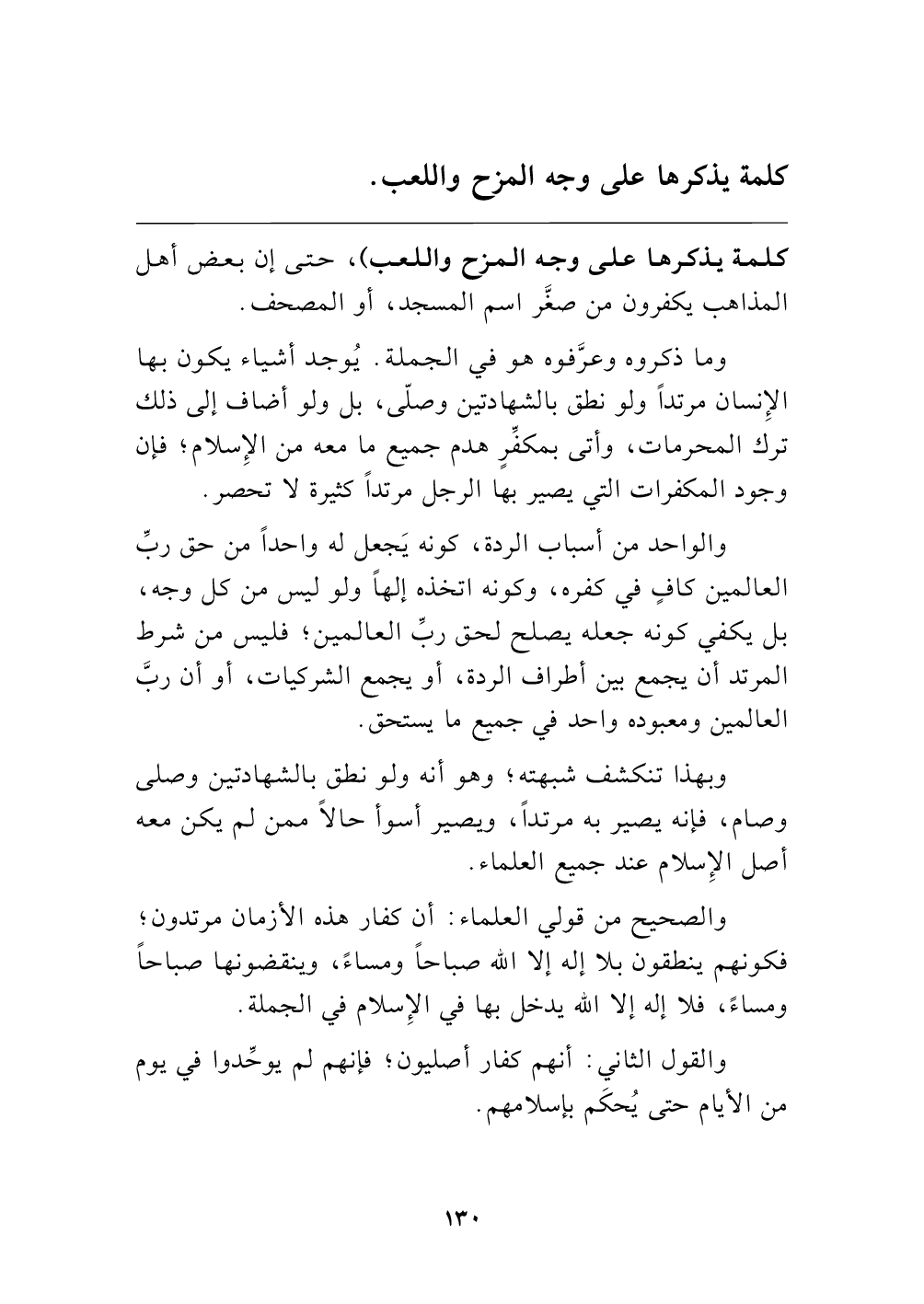 والعمل (مسألة كبيرة طويلة) جداً (تبين لك إذا تأملتها في ألسنة الناس) في أحوال الناس وأردت تحصيل ثلاثة أمور: كونهم اعتقدوه، ونطقوا به بألسنتهم، وكمَّلوه بأعمالهم؛ فإنك تجد الأكثر لم يكملوا هذه الثلاثة، بل إما هذا وإما هذا وإما اثنان (ترى من يعرف الحق) لكن (يترك العمل به) وهذا مثل علماء اليهود ومثل فرعون ومثل إبليس (لخوف نقص دنيا أو جاه أو مداراة) هذا قسم. (و) القسم الثاني (ترى من يعمل به ظاهراً) أما قلبُه فلا يصل إليه حقيقة الاعتقاد (فإذا سألته عما يعتقده بقلبه فإذا هو لا يعرفه) فالأول كثير، والثاني دونه والثالث قليل؛ فالذي يعرفه وينطق به كثير وكذلك الذي يعتقده ويتكلم به كثير، والثالث الذي يعتقد ويعمل ولا ينطق وهو قليل.