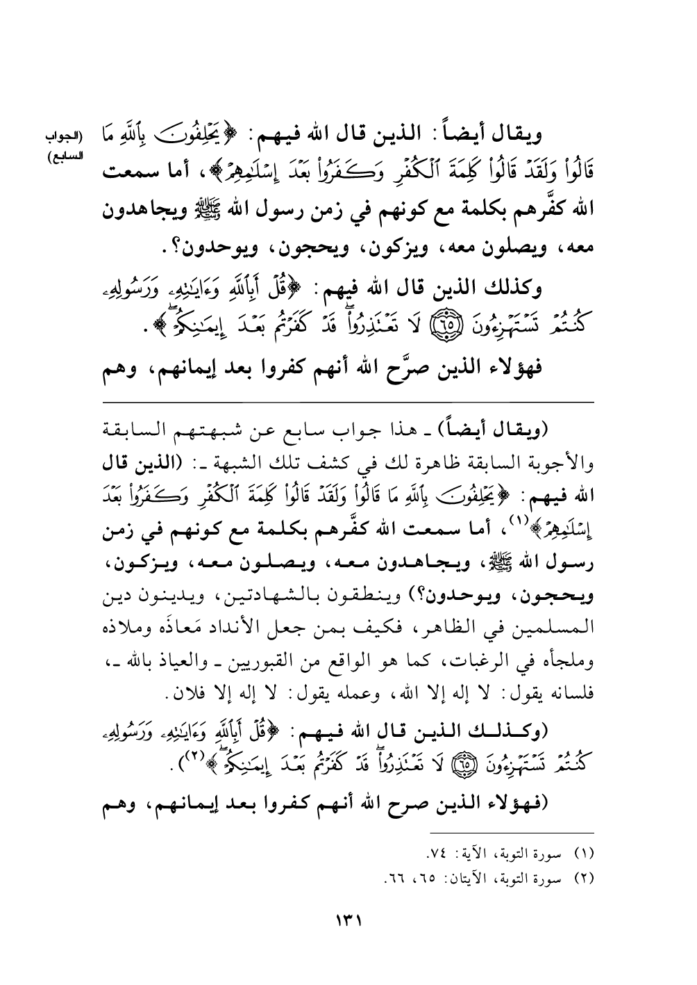 ما قرره المصنف من أن التوحيد لابد أن يكون بالقلب واللسان والعمل ... إلخ، (أولاهما ما تقدم من قوله: {لا تَعْتَذِرُوا قَدْ كَفَرْتُمْ بَعْدَ إِيمَانِكُمْ} 1 فإذا تحققت أن بعض الصحابة الذين غزوا الروم مع الرسول صلى الله عليه وسلم كفروا بسبب كلمة) واحدة (قالوها على وجه المزح واللعب، تبين لك أن الذي يتكلم بالكفر أو يعمل به خوفا من نقص مال أو جاه أو مداراة لأحدٍ أعظم ممن تكلم بكلمة يمزح بها) وأولى وأحق بالكفر ممن تكلم بكلمة يمزح بها وهو من الصحابة؟ أفالصحابة الذين قالوها يصيرون كفاراً وهؤلاء لا يصيرون كفاراً؟!