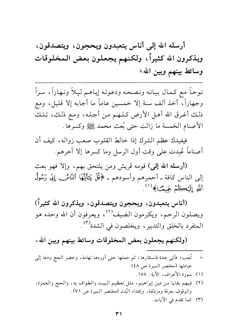 فإذا تحقَّقت أنهم مقرون بهذا ولم يُدخِلهم في التوحيد الذي دعاهم إليه رسول الله صلى الله عليه وسلم، وعرفت أن التوحيد الذي جحدوه هو توحيد العبادة الذي يسميه المشركون في زماننا الاعتقاد، كما كانوا يدعون الله ليلاً ونهاراً؛ ثم منهم من يدعو الملائكة لأجل صلاحهم وقربهم من الله، أو يدعو رجلاً صالحاً مثل اللات، أو نبياً مثل عيسى.