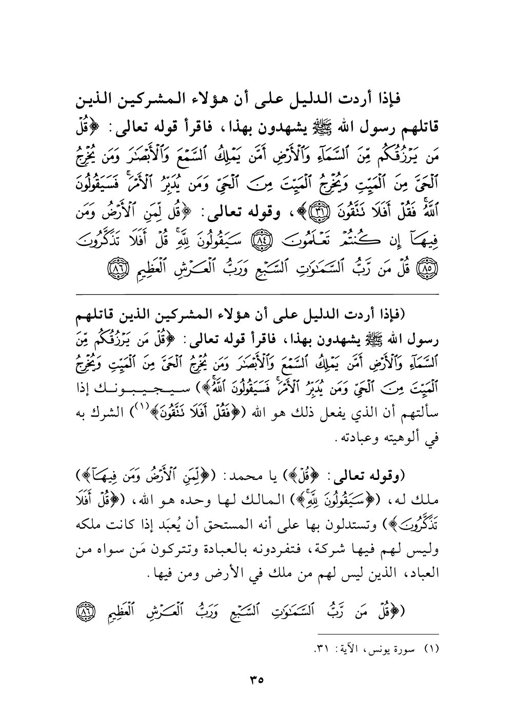 يريدون شفاعَتهم والتقرُّبَ إلى الله بذلك هو الذي أحلَّ دماءهم وأموالهم، عرفت حينئذٍ التوحيدَ الذي دعت إليه الرسل وأبى عن الإِقرار به المشركون) إذا تأملت ما مرَّ من قوله (إذا تحققت) وما عُطِف عليها، تبيَّن لك التوحيد الذي دعت إليه الرسل وأبى عن الإقرار به المشركون، وعرفت حقيقته؛ أنه توحيد الألوهية والعبادة.