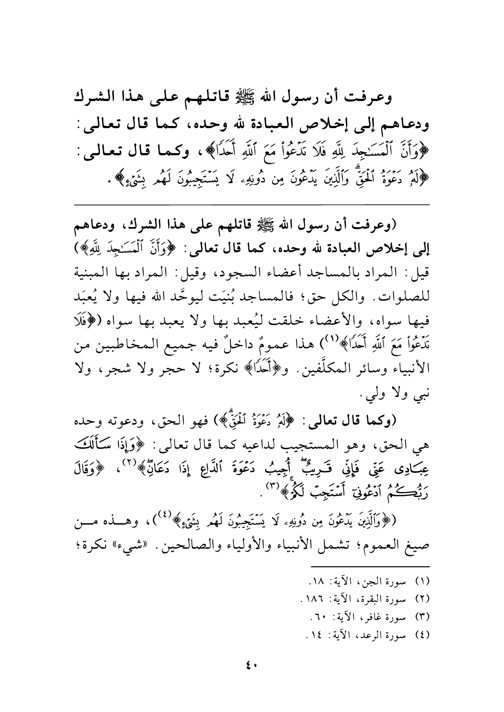 حقيقة دين المرسلين وحقيقة دين المشركين (الذي قال الله فيه: {إِنَّ اللَّهَ لا يَغْفِرُ أَنْ يُشْرَكَ بِهِ} الآية1) ، وتصوَّرته ما هو، وقد قدم لك المصنف ما يُعرِّفك به فيما قرَّره من معرفة التوحيد؛ فإن التوحيد يتبين ضده الشرك (وعرفت دين الله الذي بعث به الرسل من أولهم إلى آخرهم الذي لا يقبل الله من أحد سواه) يعني الذي هو التوحيد. وتقدَّم هذان الأمران مُقَرَّرَين لك في صدر هذا الكتاب: دين المرسلين ودين المشركين. (وعرفت ما أصبح غالبُ الناس فيه من الجهل بهذا) بالتوحيد والشرك؛ فإن أكثرهم ما عرف دين الله هذا، بل عادَوا أهل التوحيد وعابوهم وحاربوهم، واتبعوا دين المشركين كله بسبب عدم الفرق بين هذا وهذا، إذا عرفت هذه الأمور الأربعة معرفة قلب (أفادك فائدتين) عظيمتين.