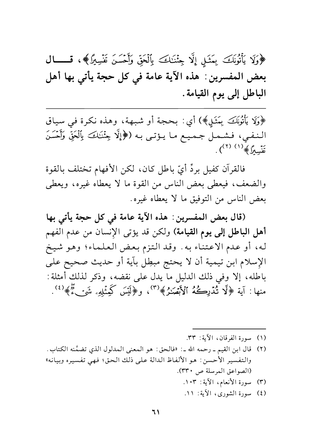 (فإن قال) المشبِّه (هؤلاء الآيات) يعني آية: {وَيَعْبُدُونَ مِنْ دُونِ اللَّهِ مَا لا يَضُرُّهُمْ وَلا يَنْفَعُهُمْ وَيَقُولُونَ هَؤُلاءِ شُفَعَاؤُنَا عِنْدَ اللَّهِ} ونحوها (نزلت فيمن يعبد الأصنام) إن انتقل إلى هذه الشبهة وهي حصرُ عبادة غير الله في الأصنام، يعني وما سواه فليس بعبادة، فليس مثلهم، هو يدعو الصالحين وليس بمشرك! (كيف تجعلون الصالحين مثل الأصنام؟) حصر عبادة غير الله في الأصنام (أم كيف تجعلون الأنبياء أصناماً؟) من شأن أهل الباطل وأشباههم نسبتهم مَن نَزَّل الصالحين منازلَهم أن يقولوا: تنقصوهم وهضموهم. وفي الحقيقة هم الناقصون المنتقِّصون للرسل وأرادوا أن يُعطَوْا باطلاً. وأهل الحق نزلوهم منازلهم الحق اللائقة بهم وما جاءوا به، ولا زادوا ولا نقصوا؛ أعطوهم حقهم الواجب ونزَّهوهم عما لا يصلح