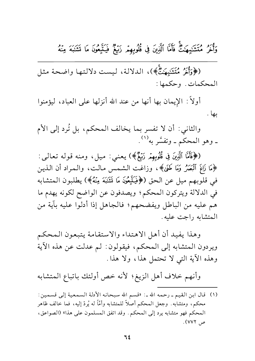 فعرفت من هذه الآيات أن من المشركين من يدعو الأولياء والصالحين، ومنهم من يدعو الأنبياء، ومنهم من يدعو الملائكة. وأن الآيات منها ما نزل فيمن يعبد الأولياء، وبعضها فيمن يعبد الأنبياء، وبعضها فيمن يعبد الملائكة، وأنها ليست منحصرة فيمن يعبد الأصنام فقط؛ فلا فرق بين المعبودات، بل الكلُّ تسويةُ المخلوق بالخالق، والكل عدل به تعالى سواه في العبادة، فالكل شرك والكل مشركون. فعرفت من الآيات أنه مثلُهم فبذلك انكشفت شبهتُه واندحضت حجته.