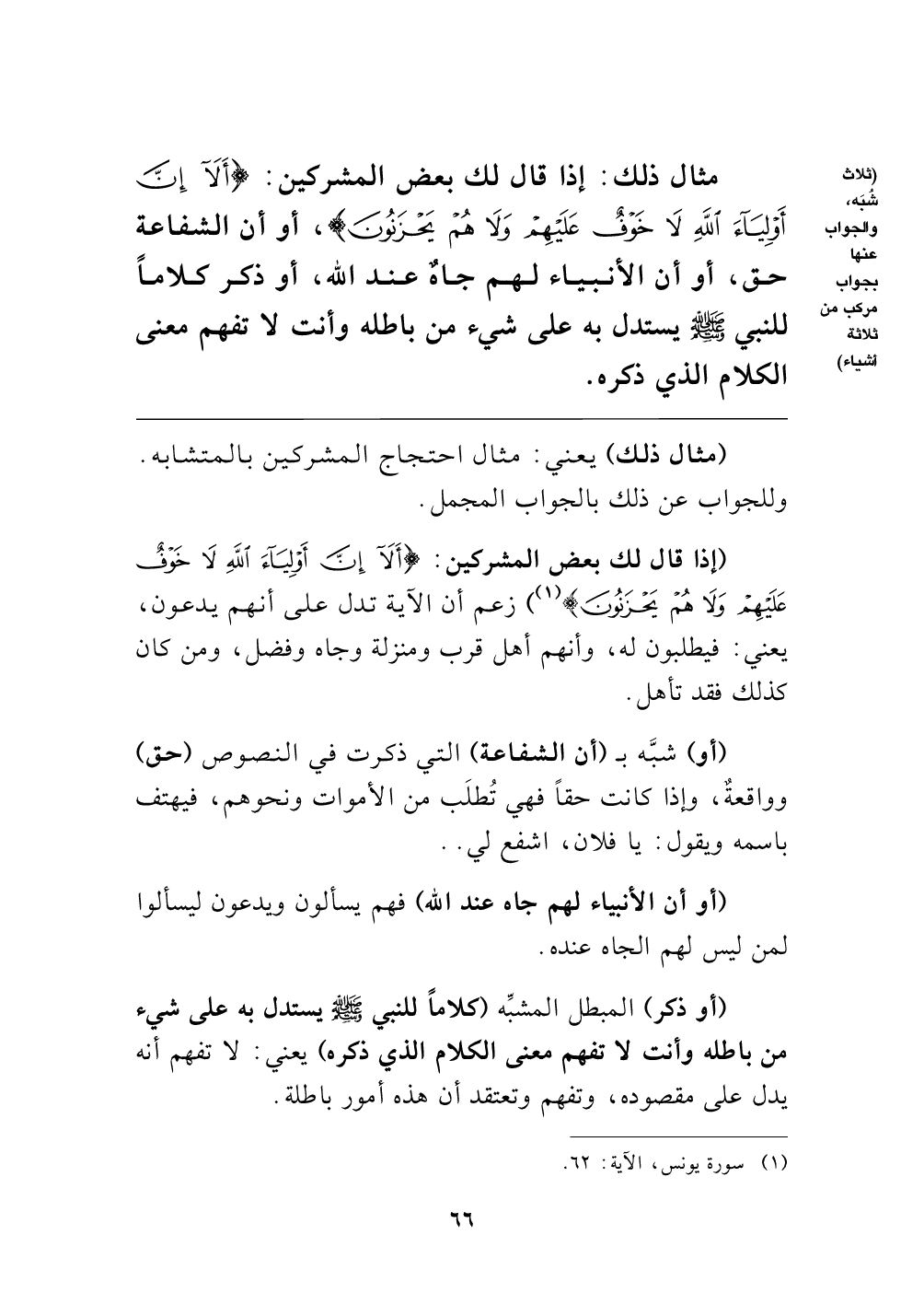 فالجواب أن هذا قول الكفار سواءً بسواء، واقرأ عليه قوله تعالى: {وَالَّذِينَ اتَّخَذُوا مِنْ دُونِهِ أَوْلِيَاءَ مَا نَعْبُدُهُمْ إِلاّ لِيُقَرِّبُونَا إِلَى اللَّهِ زُلْفَى} . وقوله تعالى: {وَيَقُولُونَ هَؤُلاءِ شُفَعَاؤُنَا عِنْدَ اللَّهِ} .