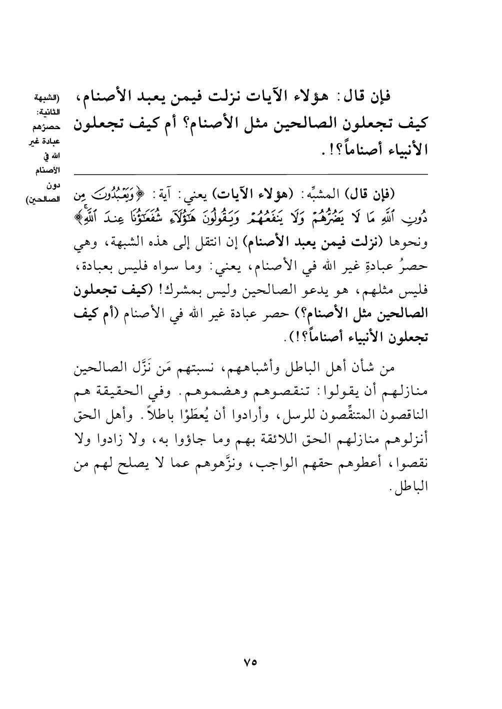1 أي ملازمة بين كونه أُعطي الشفاعة وبين كونها تُطلب منه، والمشركون أكثر ما يعبدون صلحاء ومع ذلك أي دليل على طلبها أقر أحد أو جاء شيء من النصوص؟! الصحابة طلبوه إياها؟! بل النصوص جاءت بالنهي عن ذلك. وما دعاء غير الله؟ هو أن يقول: يا فلان، اشفع لي. هذا شركهم؛ يدعون مخلوقاً رجاء شفاعته، فصار لا فرق بين أن يصرِّح بنفس تلك العبارة فيقول اشفع لي، أو يذبح لأن يشفع له. (عبارة أخرى) .