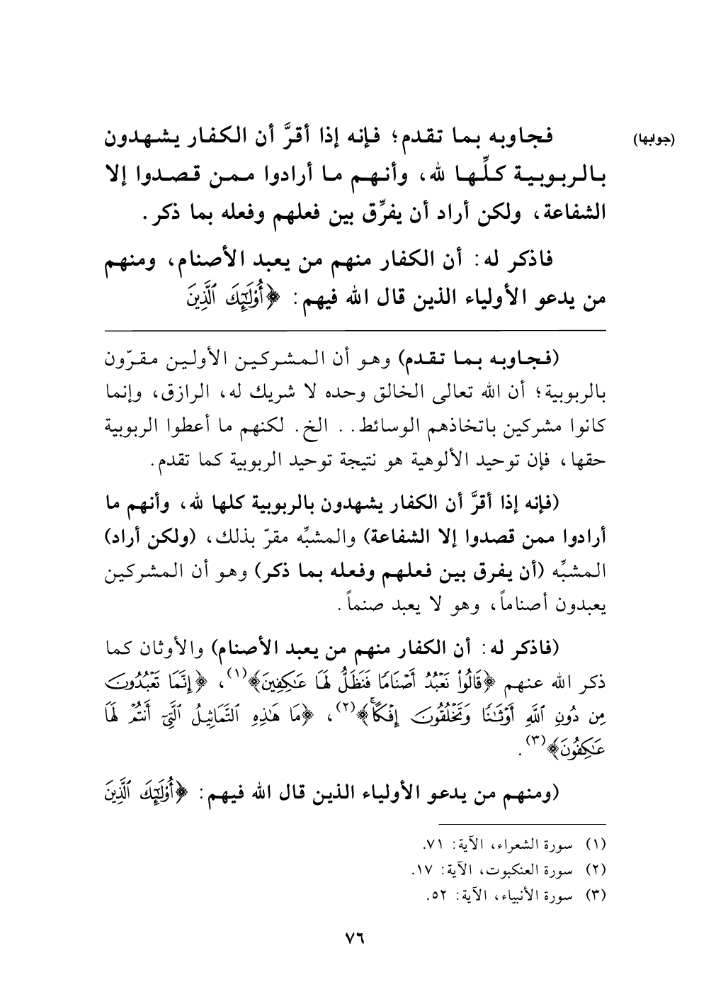 (وأيضاً فإن الشفاعة أعطيها غير النبي صلى الله عليه وسلم) هذا جواب ثانٍ لكشف الشبهة السابقة، تقدم الأول وهو كافٍ شافٍ في كشف شبهته، وهذا الثاني (فصحَّ أن الملائكة يشفعون والأفراط يشفعون) فجنس الشفاعة أعطيها غير النبي صلى الله عليه وسلم ولكن هذا الإعطاء مقيد