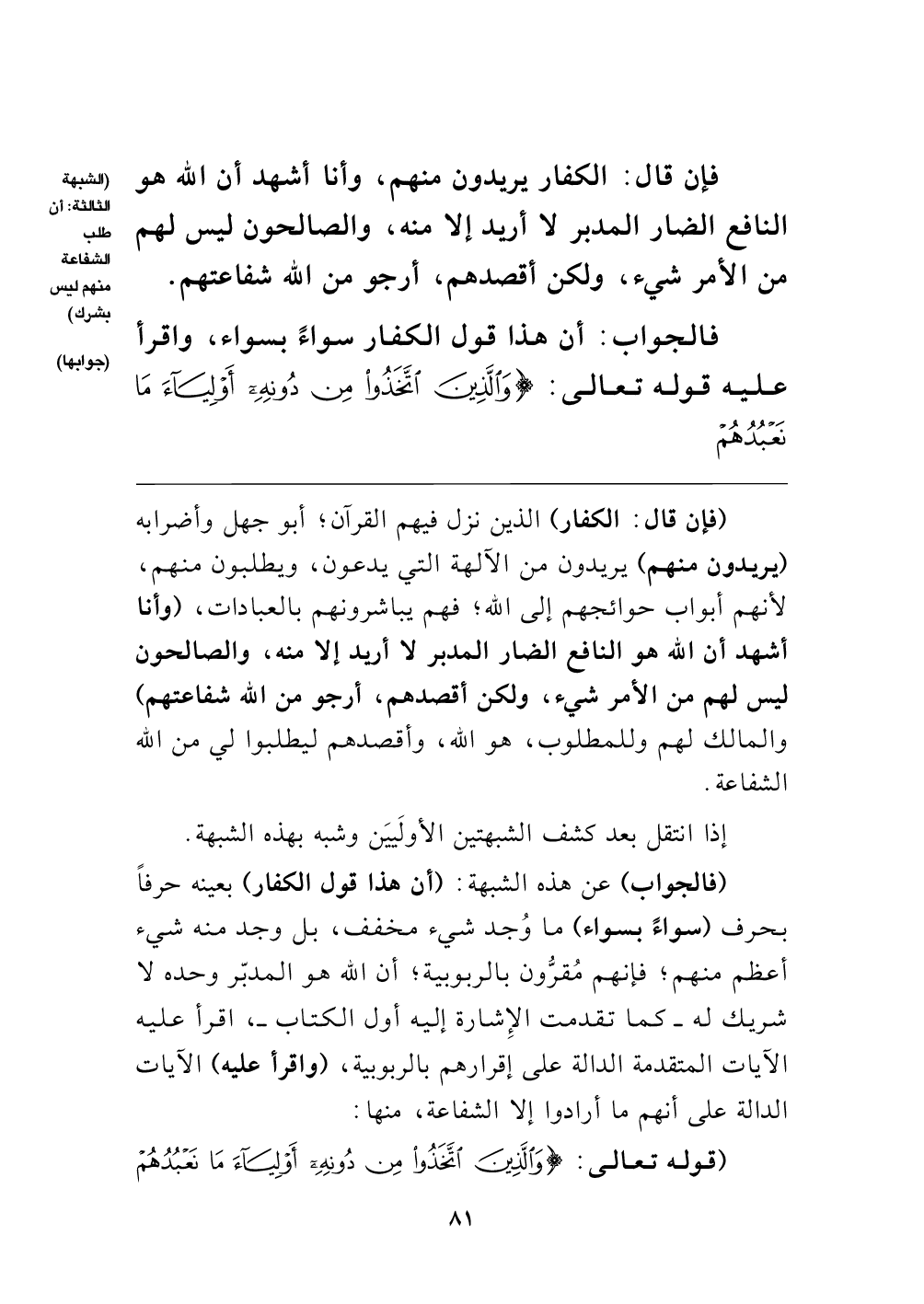 يعني: وحاصلُ الجواب عن الشبه الثلاث أنك تتحدَّاه؛ فله ثلاثة أحوال: أحدهما: أن يتوقَّف، فقل له: أنت لا تعرف الحق من الباطل، فإذا حَادَ ولا درى ووقف فهو كافٍ في ردِّ شُبَهه، وحينئذ كفانا مؤنَة جوابه؛ فإنَّ هذا حال كثير ممن يعبد الأصنام؛ لا يدري عن الشرك ولا أهله ولا درى عن عبادة الأصنام ولا ميَّز عبادة الأصنام من غيرها، وإن فسرها بما فسره القرآن، فهذا أيضاً كفانا مؤنته وهدم أصله الذي بنى عليه، وإن فسره بالباطل