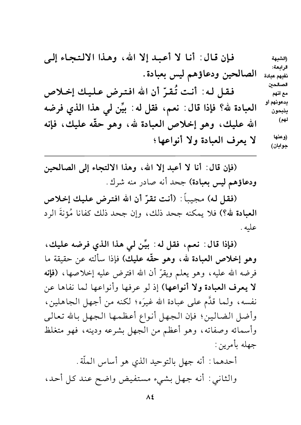 (وقال تعالى: {قُلْ أَرَأَيْتَكُمْ إِنْ أَتَاكُمْ عَذَابُ اللَّهِ أَوْ أَتَتْكُمُ السَّاعَةُ أَغَيْرَ اللَّهِ تَدْعُونَ إِنْ كُنْتُمْ صَادِقِينَ بَلْ إِيَّاهُ تَدْعُونَ فَيَكْشِفُ مَا تَدْعُونَ إِلَيْهِ إِنْ شَاءَ وَتَنْسَوْنَ مَا تُشْرِكُونَ} 2. وقال تعالى: {وَإِذَا مَسَّ الإِنْسَانَ ضُرٌّ دَعَا رَبَّهُ مُنِيباً} إلى قوله: {قُلْ تَمَتَّعْ بِكُفْرِكَ قَلِيلاً إِنَّكَ مِنْ أَصْحَابِ النَّارِ} 3 وقوله تعالى: {وَإِذَا غَشِيَهُمْ مَوْجٌ كَالظُّلَلِ دَعَوُا اللَّهَ مُخْلِصِينَ لَهُ الدِّينَ} 4) هذه الآيات ونظائرها دالة على أنهم