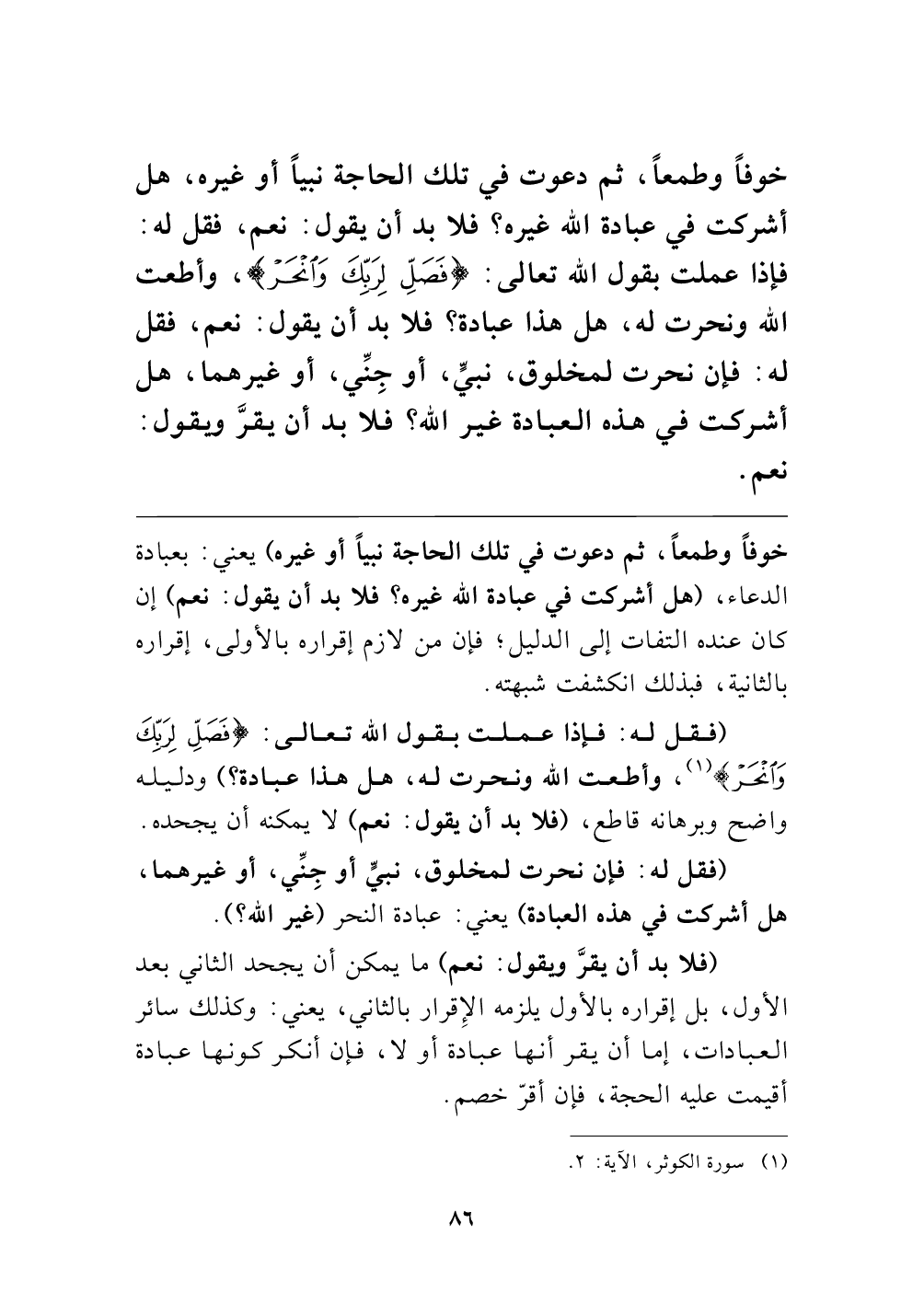 (الأمر الثاني) تقدم الأمر الأول الذي صار به المشركون الأولون أعظم شركاً من أهل زماننا (أن) المشركين (الأولين يدعون مع الله أُنَاساً مقربين عند الله: إما أنبياء وإما أولياء وإما ملائكة) أو صالحين (أو يدعون أحجاراً أو أشجاراً مطيعة لله ليست عاصية) الكائنات كلها مطيعة لله {وَإِنْ مِنْ شَيْءٍ إِلَّا يُسَبِّحُ بِحَمْدِهِ} {وَلِلَّهِ يَسْجُدُ مَنْ فِي السَّمَاوَاتِ وَالْأَرْضِ طَوْعاً وَكَرْهاً وَظِلالُهُمْ بِالْغُدُوِّ وَالْآصَالِ} (وأهل زماننا يدعون مع اللهِ أناساً من أفسق الناس) بل منهم من يدعو أُناساً من أكفر الناس، بل بعضهم أكفر من اليهود والنصارى؛ كالذين