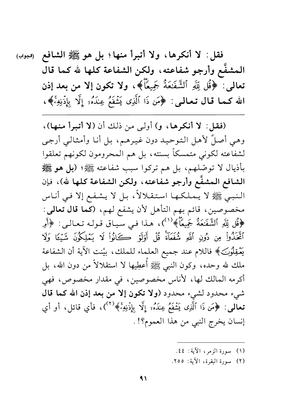 ولما لم يَنْقَد أناسٌ في زمن النبي صلى الله عليه وسلم للحج أنزل الله في حقهم {وَلِلَّهِ عَلَى النَّاسِ حِجُّ الْبَيْتِ مَنِ اسْتَطَاعَ إِلَيْهِ سَبِيلاً وَمَنْ كَفَرَ فَإِنَّ اللَّهَ غَنِيٌّ عَنِ الْعَالَمِينَ} ومن أقر بهذا كله وجحد البعث كفر بالإجماع وحل دمُه ومالُه كما قال تعالى: {إِنَّ الَّذِينَ يَكْفُرُونَ بِاللَّهِ وَرُسُلِهِ وَيُرِيدُونَ أَنْ يُفَرِّقُوا بَيْنَ اللَّهِ وَرُسُلِهِ وَيَقُولُونَ نُؤْمِنُ بِبَعْضٍ وَنَكْفُرُ بِبَعْضٍ وَيُرِيدُونَ أَنْ يَتَّخِذُوا بَيْنَ ذَلِكَ سَبِيلاً أُولَئِكَ هُمُ الْكَافِرُونَ حَقّاً} الآية.