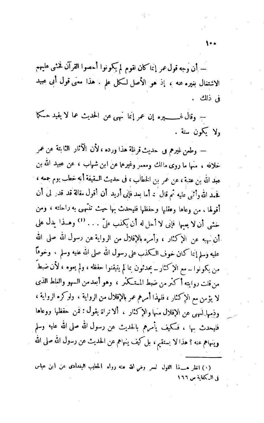 وهذا يدل على أَنَّ نهيه عن الإكثار، وأمره بالإقلال من الرواية عن رسول الله - صَلََّى اللهُ عَلَيْهِ وَسَلَّمَ - إنما كان خوف الكذب على رسول الله - صَلََّى اللهُ عَلَيْهِ وَسَلَّمَ -، وخوفًا من [أَنْ] يكونوا - مع الإكثار - يُحَدِّثُونَ بما لم يَتَيَقَّنُوا حِفْظَهُ، وَلَمْ يَعُوهُ، لأنَّ ضبط من قَلَّتْ روايته أكثر من ضبط المستكثر، وهو أبعد من السهو والغلط الذي لا يؤمن مع الإكثار، فلهذا أمرهم بالإقلال من الرواية، ولو كره الرواية، وَذَمَّهَا لنهي عن الإقلال منها والإكثار، ألا تراه يقول: «فَمَنْ حَفِظَهَا وَوَعَاهَا، فَلْيُحَدِّثْ بِهَا»، فكيف يأمرهم بالحديث عن رسول الله - صَلََّى اللهُ عَلَيْهِ وَسَلَّمَ - وينهاهم عنه؟ هذا لا يستقيم، بل كيف ينهاهم عن الحديث عن رسول الله - صَلََّى اللهُ