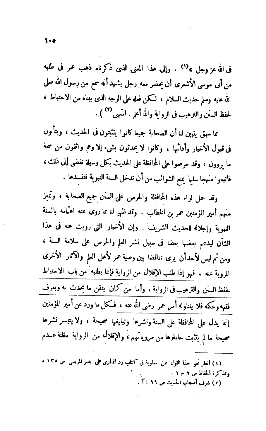 وقد حمل لواء هذه المحافظة والحرص على السنن جميع الصحابة، وتميز منهم أمير المؤمنين عمر بن الخطاب. وقد ظهر لنا مما رُوِيَ عنه اهتمامه بِالسُنَّةِ النَّبَوِيَّةِ وإجلاله للحديث الشريف. وَإِنَّ الأخبار التي رويت عنه في هذا الشأن ليدعم بعضها بعضًا في سبيل نشر العلم والحرص على سلامة السُنَّةِ، ومن ثم ليس لأحد أنْ يرى تَنَاقُضًا بين وصية عمر لأهل العلم والآثار الأخرى المروية عنه، فهو إذا طلب الإقلال من الرواية فإنما يطلبه من باب الاحتياط لحفظ السُنَنِ والترهيب من الرواية، وأما من كان يتقن ما يُحَدِّثُ به ويعرف فقهه وحكمه فلا يتناوله أمر عمر - رَضِيَ اللهُ عَنْهُ -، فكل ما ورد عن أمير المؤمنين إنما يدل على المحافظة على السُنَّةِ ونشرها وتبليغها صحيحة، وَلاَ يَتَيَسَّرُ نشرها صحيحة مَا لَمْ يَتَثَبَّتْ حاملوها من مروياتهم، والإقلال من الرواية مظن عدم