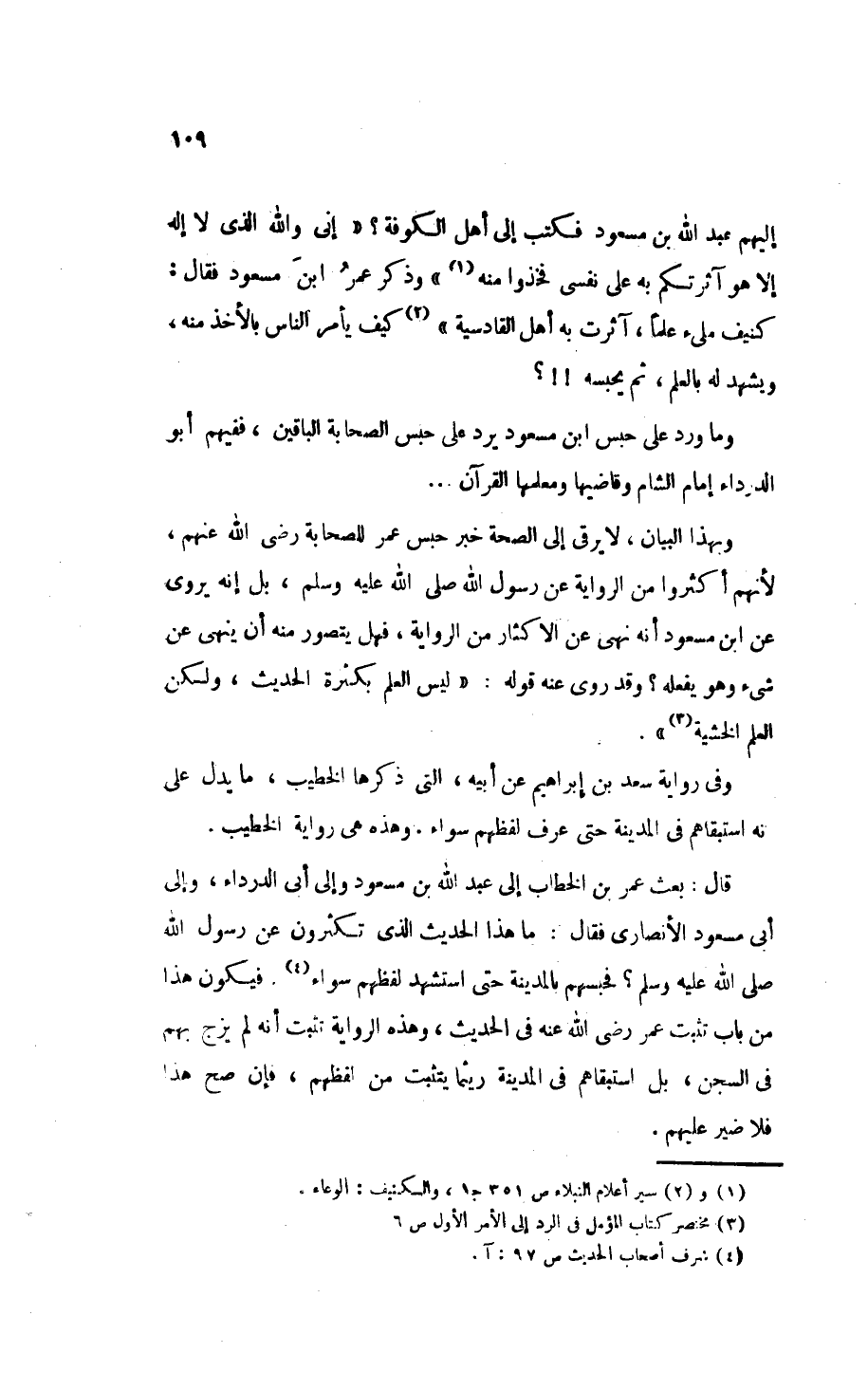 وبهذا البيان، لا يرقى إلى الصحة خبر حبس عمر للصحابة - رَضِيَ اللهُ عَنْهُمْ -، لأنهم أكثروا من الرواية عن رسول الله - صَلََّى اللهُ عَلَيْهِ وَسَلَّمَ -، بل إنه يُرْوَى عن ابن مسعود أنه نهى عن الإكثار من الرواية، فهل يُتَصَوَّرُ مِنْهُ أَنْ يَنْهَى عَنْ شَيْءٍ وَهُوَ يَفْعَلُهُ؟ وقد رُوِيَ عنه قوله: «لَيْسَ العِلْمُ بِكَثْرَةِ الحَدِيثِ، وَلَكِنَّ العِلْمَ الخَشْيَةَ» (¬3).