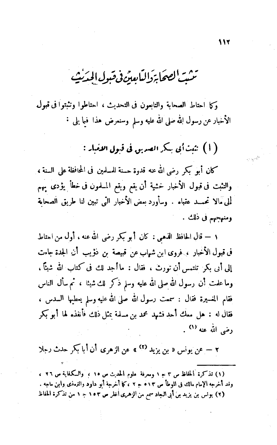 1 - قال الحافظ الذهبي: «كَانَ أَبُو بَكْرٌ - رَضِيَ اللهُ عَنْهُ -، أَوَّلَ مَنْ احْتَاطَ فِي قَبُولِ الأَخْبَارِ، فَرَوَى ابْنُ شِهَابٍ عَنْ قَُبَيْصَةَ بْنِ ذُؤَيْبٍ أَنََّ الجَدََّةَ جَاءَتْ إِلَى أَبِي بَكْرٍ تَلْتَمِسُ أَنْ تُوَرَّثَ، فَقَالَ: " مَا أَجِدُ لَكَ فِي كِتَابِ اللَّهِ شَيْئًا، وَمَا عَلِمْتُ أَنَّ رَسُولَ الْلَّهِ صَلَّىَ اللَّهُ عَلَيْهِ وَسَلَّمَ ذَكَرَ لَكِ شَيْئًا "، ثُمَّ سَأَلَ النَّاسَ فَقَامَ المُغيرَةُ فَقَالَ: " سَمِعُتُ رَسُولَ الْلَّهِ صَلَّىَ اللَّهُ عَلَيْهِ وَسَلَّمَ يُعْطِيهَا الْسُّدُسَ ". فَقَالَ لَهُ: " هَلْ مَعَكَ أَحَدٌ؟ " فَشَهِدَ مُحَمَّدٌ بْن مَسْلَمَةَ بِمِثْلِ ذَلِكَ فَأَنْفَذَهُ لَهَا أَبُوْ بَكْرٍ - رَضِيَ الْلَّهُ عَنْهُ -» (¬1).