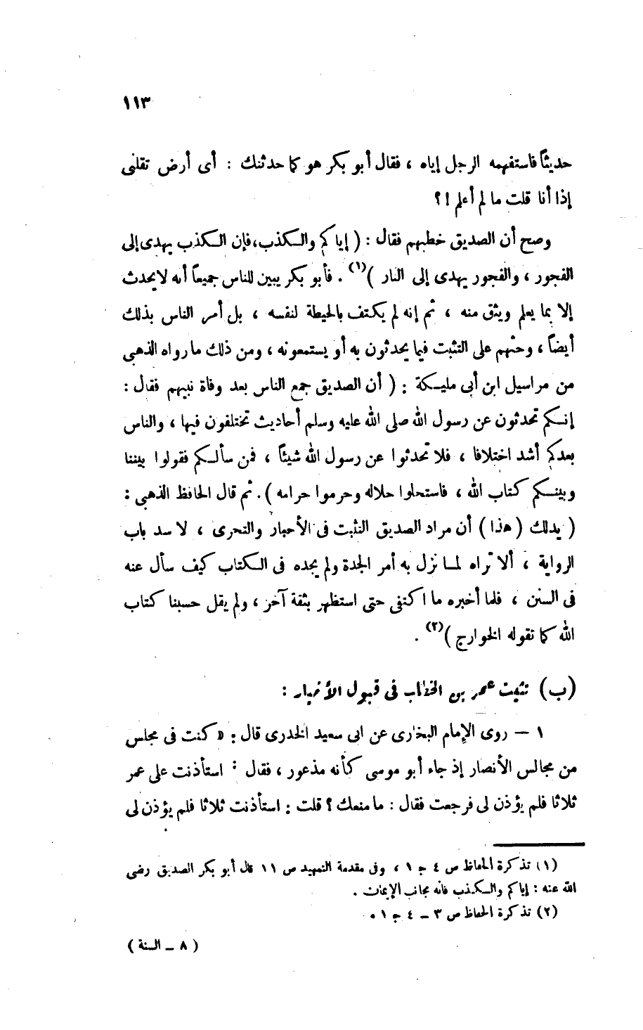 (¬1) " تذكرة الحفاظ ": ص 4 جـ 1، وفي مقدمة " التمهيد ": ص 11: قال أبو بكر الصِدِّيق - رَضِيَ اللهُ عَنْهُ -: «إِيَّاكُمْ وَالكَذِبَ، فَإِنَّهُ مُجَانِبُ الإِيمَانِ».