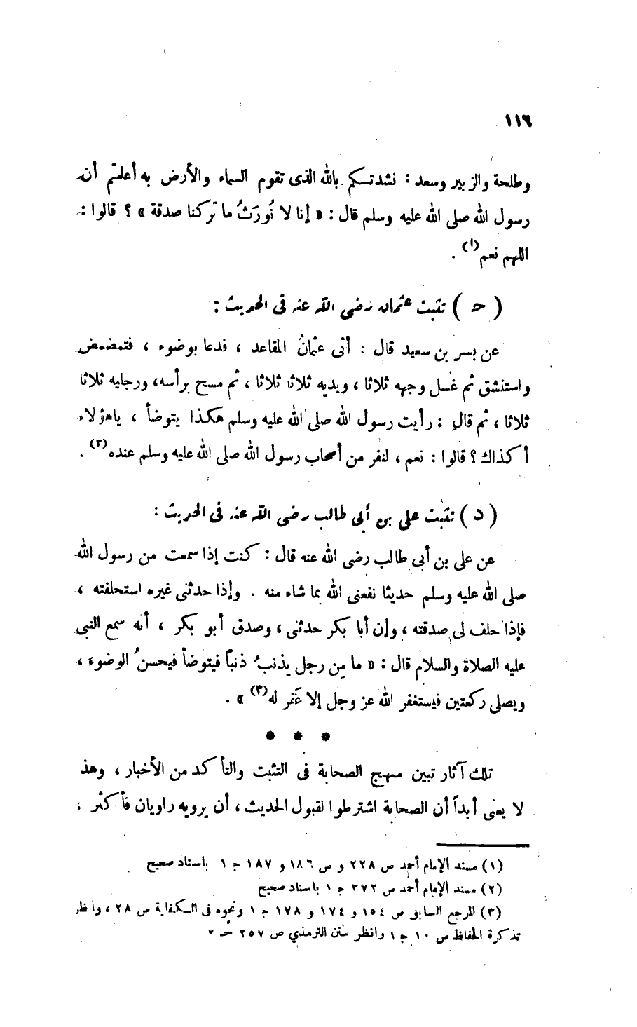 عَنْ بُسْرِ بْنِ سَعِيدٍ، قَالَ: أَتَى عُثْمَانُ الْمَقَاعِدَ، فَدَعَا بِوَضُوءٍ فَتَمَضْمَضَ، وَاسْتَنْشَقَ، ثُمَّ غَسَلَ وَجْهَهُ ثَلاثًا، وَيَدَيْهِ ثَلاثًا ثَلاثًا، ثُمَّ مَسَحَ بِرَأْسِهِ، وَرِجْلَيْهِ ثَلاثًا ثَلاثًا، ثُمَّ قَالَ: «رَأَيْتُ رَسُولَ اللهِ صَلَّى اللهُ عَلَيْهِ وَسَلَّمَ هَكَذَا يَتَوَضَّأُ، يَا هَؤُلاءِ أَكَذَاكَ؟» قَالُوا: نَعَمْ. لِنَفَرٍ مِنْ أَصْحَابِ رَسُولِ اللهِ صَلَّى اللهُ عَلَيْهِ وَسَلَّمَ عِنْدَهُ (¬2).