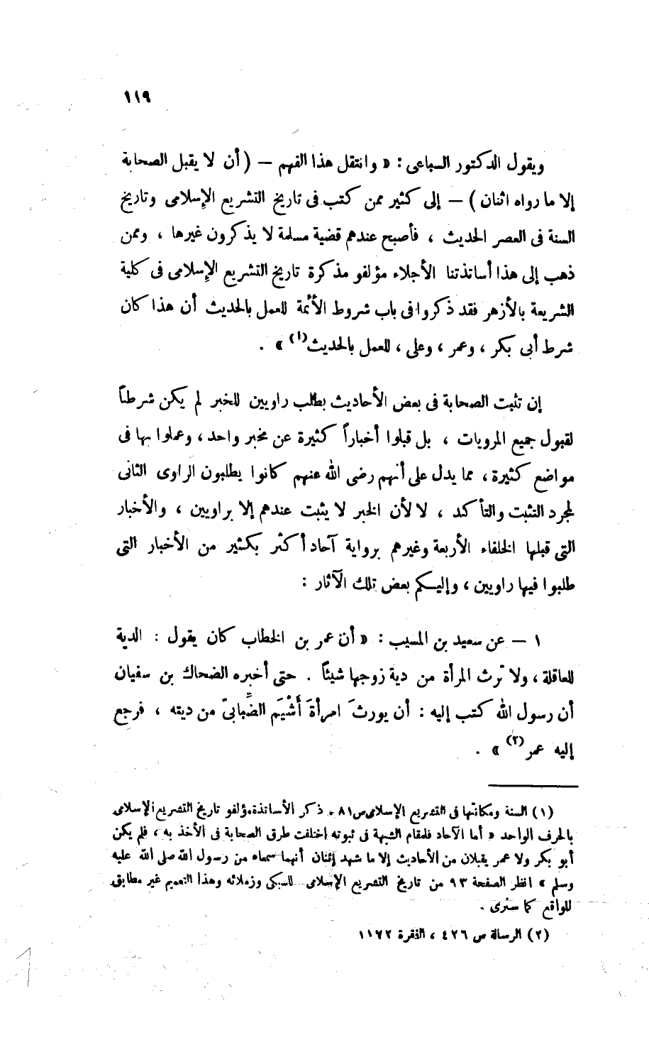(¬1) " السنة ومكانتها في التشريع الإسلامي ": ص 81. ذكر الأساتذة مُؤَلِّفُو " تاريخ التشريع الإسلامي " بالحرف الواحد: «أَمَا الآحَادُ فَلِمَقَامِ الشُبْهَةِ فِي ثُبُوتِهُ اِخْتَلَفَتْ طُرُقُ الصَّحَابَةِ فِي الأَخْذِ بِهِ، فَلَمْ يَكُنْ أَبُو بَكْرٍ وَلاَ عُمَرَ يَقْبَلاَنِ مِنْ الأَحَادِيثِ إلاَّ مَا شَهِدَ اثْنَانِ أَنَّهُمَا سَمِعَاهُ مِنْ رَسُولِ اللهِ - صَلَّى اللهُ عَلَيْهِ وَسَلَّمَ -». انظر الصفحة 93 من " تاريخ التشريع الإسلامي " لِلْسُّبْكِي وزملائه، وهذا التعميم غير مطابق للواقع كما سنرى.