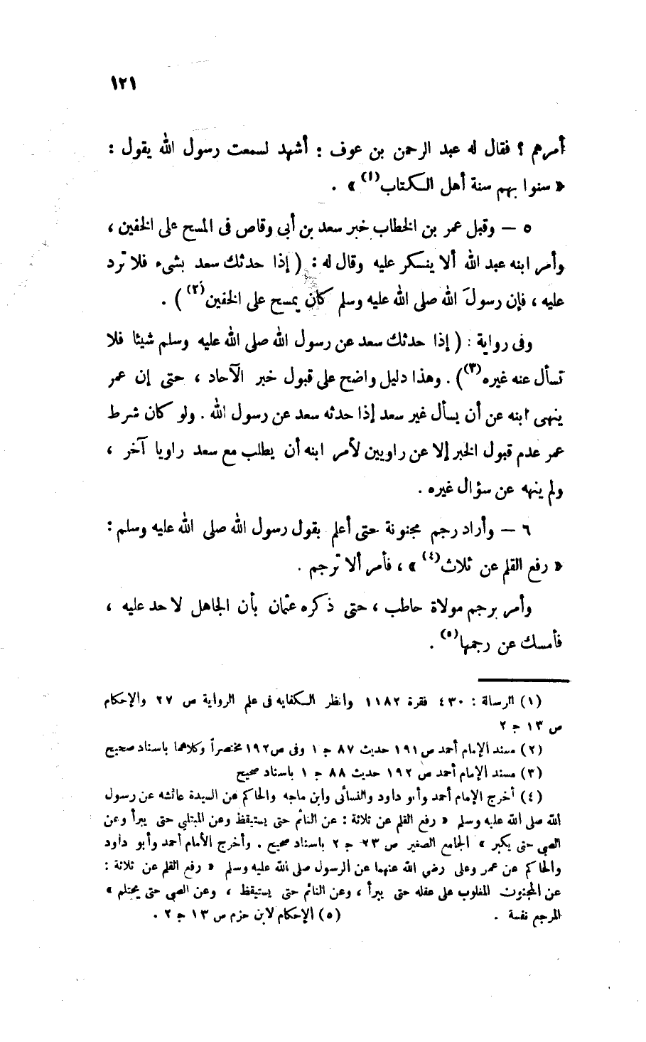 (¬4) أخرج الإمام أحمد وأبو داود والنسائي وابن ماجه والحاكم عن السيدة عَائِشَة عَنْ رَسُولِ اللهِ - صَلَّى اللهُ عَلَيْهِ وَسَلَّمَ -: «رُفِعَ القَلَمُ عَنْ ثَلاَثَةٍ: عَنْ النَّائِمِ حَتَّى يَسْتَيْقِظَ، وَعَنْ المُبْتَلَى حَتَّى يَبْرَأَ، وَعَنْ الصَّبِيِّ حَتَّى يَكْبُرَ» " الجامع الصغير ": ص 23، جـ 2 بإسناد صحيح. وأخرج الإمام أحمد وأبو داود والحاكم عن عمر وعَلِيٍّ - رَضِيَ اللهُ عَنْهُمَا - عَنْ الرَّسُولِ - صَلَّى اللهُ عَلَيْهِ وَسَلَّمَ - «رُفِعَ القَلَم عَنْ ثَلاَثَةٍ: عَنْ المَجْنُونِ المَغْلُوبِ عَلَى عَقْلِهِ حَتَّى يَبْرَأَ، وَعَنْ النَّائِم حَتَّى يَسْتَيْقِظَ، وَعَنْ الصَّبِيِّ حَتَّى يَحْتَلِمَ». المرجع نفسه.