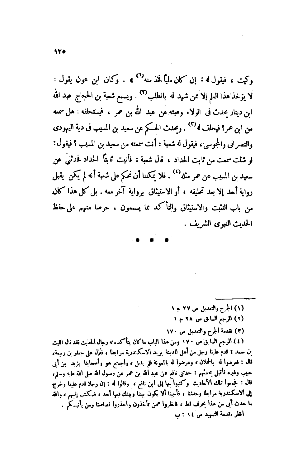 وَكِيتَ، فَيَقُولُ لَهُ: " إِنْ كَانَ مَلِيًّا فَخُذْ مِنْهُ "» (¬1). وكان ابن عون يقول: «لاَ يُؤْخَذُ هَذَا العِلْمُ إِلاَّ مِمَّنْ شُهِدَ لَهُ بِالطَّلَبِ (¬2)». ويسمع شُعْبَةُ بن الحجاج عبدَ اللهِ بن دينار يُحَدِّثُ في الولاء وهبته عن عبد الله بن عمر، فيستحلفه: هل سمعه من ابن عمر؟ فيحلف له (¬3). وَيُحَدِّثُ الحَكَمُ عن سعيد بن المسيب في دية اليهودي والنصراني والمجوسي، فيقول له شعبة: «أَنْتَ سَمِعْتَهُ مِنْ سَعِيدٍ بْنِ المَسَيِّبِ؟» فَيَقُولَ: «لَوْ شِئْتَ سَمِعْتَ مِنْ ثَابِتَ الحَدَّادِ»، قَالَ شُعْبَةُ: «فَأَتَيْتُ ثابتًا الحَدَّادَ فَحَدَّثَنِي عَنْ سَعِيدٍ بْنِ المُسَيِّبِ عَنْ عُمَرَ مِثْلَهُ» (¬4). فلا يمكننا أن نحكم على شعبة أنه لم يكن يقبل رواية أحد إلا بعد تحليفه، أو الاستيثاق برواية آخر معه. بل كل هذا كان من باب التثبت والاستيثاق والتأكد مما يسمعون، حِرْصًا منهم على حفظ الحديث النبوي الشريف.