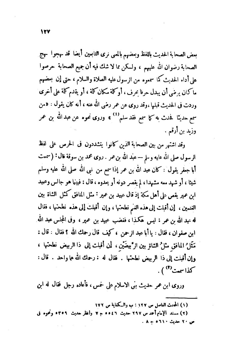 بعض الصحابة الحديث باللفظ وبعضهم بالمعنى نرى التابعين أَيْضًا قد نهجوا نهج الصحابة - رِضْوَانُ اللهِ عَلَيْهِمْ -، ولكن مما لا شك فيه أن جميع الصحابة حرصوا على أداء الحديث كما سمعوه من الرسول - عَلَيْهِ الصَلاَةُ وَالسَّلاَمُ -، حتى إن بعضهم ما كان يرضى أن يبدل حرفًا بحرف، أو كلمة مكان كلمة، أو يقدم كلمة على أخرى وردت في الحديث قبلها، وقد رُوِيَ عَنْ عُمَرَ - رَضِيَ اللهُ عَنْهُ -، أَنَّهُ كَانَ يَقُولُ: «مَنْ سَمِعَ حَدِيثًا فَحَدَّثَ بِهِ كَمَا سَمِعَ، فَقَدَ سَلِمَ (¬1)» وَرُوِيَ نَحْوَهُ عَنْ عَبْدِ اَللهِ بْنِ عُمَرَ وَزَيْدِ بْنِ أَرْقَمْ.