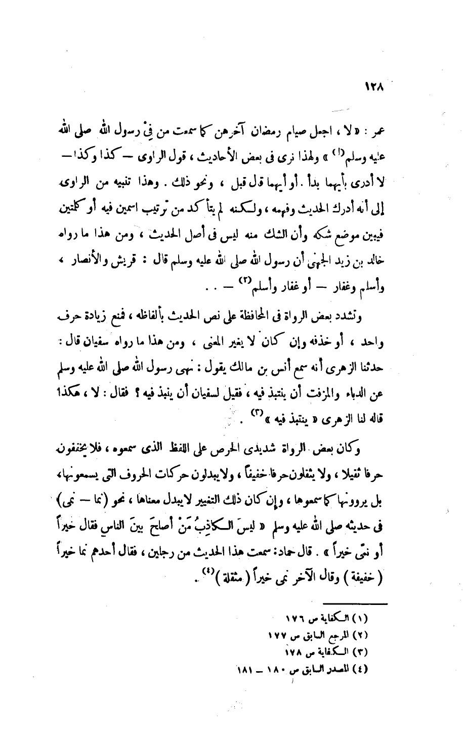 وكان بعض الرُوَّاةِ شديدي الحرص على اللفظ الذي سمعوه، فَلاَ يُخَفِّفُونَ حَرْفًا ثَقِيلاً، وَلاَ يُثَقِّلُونَ حَرْفًا خَفِيفًا، ولا يبدلون حركات الحروف التي يسمعونها، بل يروونها كما سمعوها، وإن كان ذلك التغيير لا يبدل معناها، نحو (نَمَا - نَمَّى) في حديثه - صَلََّى اللهُ عَلَيْهِ وَسَلَّمَ - «لَيْسَ الكَاذِبُ مَنْ أَصْلَحَ بَيْنَ النَّاسِ فَقَالَ خَيْرًا أَوْ نَمَى خَيْرًا» قال حماد: «سَمِعْتُ هَذَا الحَدِيثَ مِنْ رَجُلَيْنِ، فَقَالَ أَحَدُهُمْ: " نَمَا خَيْرًا " (خفيفة) وَقَالَ الآخَرُ: " نَمَّى خَيْرًا " (مثقلة)» (¬4).