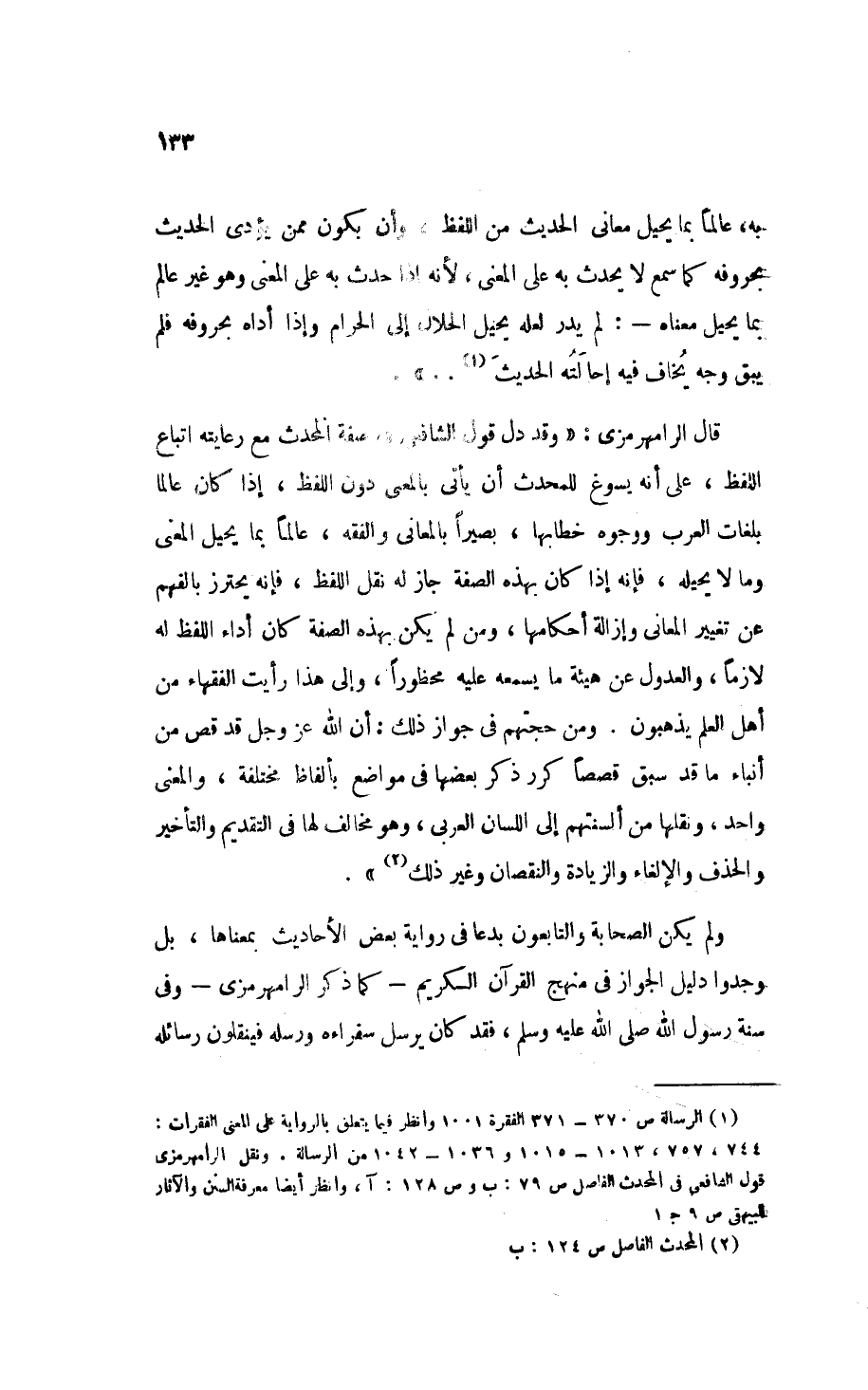 (¬1) " الرسالة ": ص 370، 371، الفقرة 1001 وانظر فيما يتعلق بالرواية على المعنى الفقرات: 744، 757، 1013 - 1015 و 1036 - 1042 من " الرسالة ". ونقل الرامهرمزي قول الشافعي في " المحدث الفاصل ": ص 79: ب وص 128: آ، وانظر أَيْضًا " معرفة السنن والآثار " للبيهقي: ص 9 جـ 1.