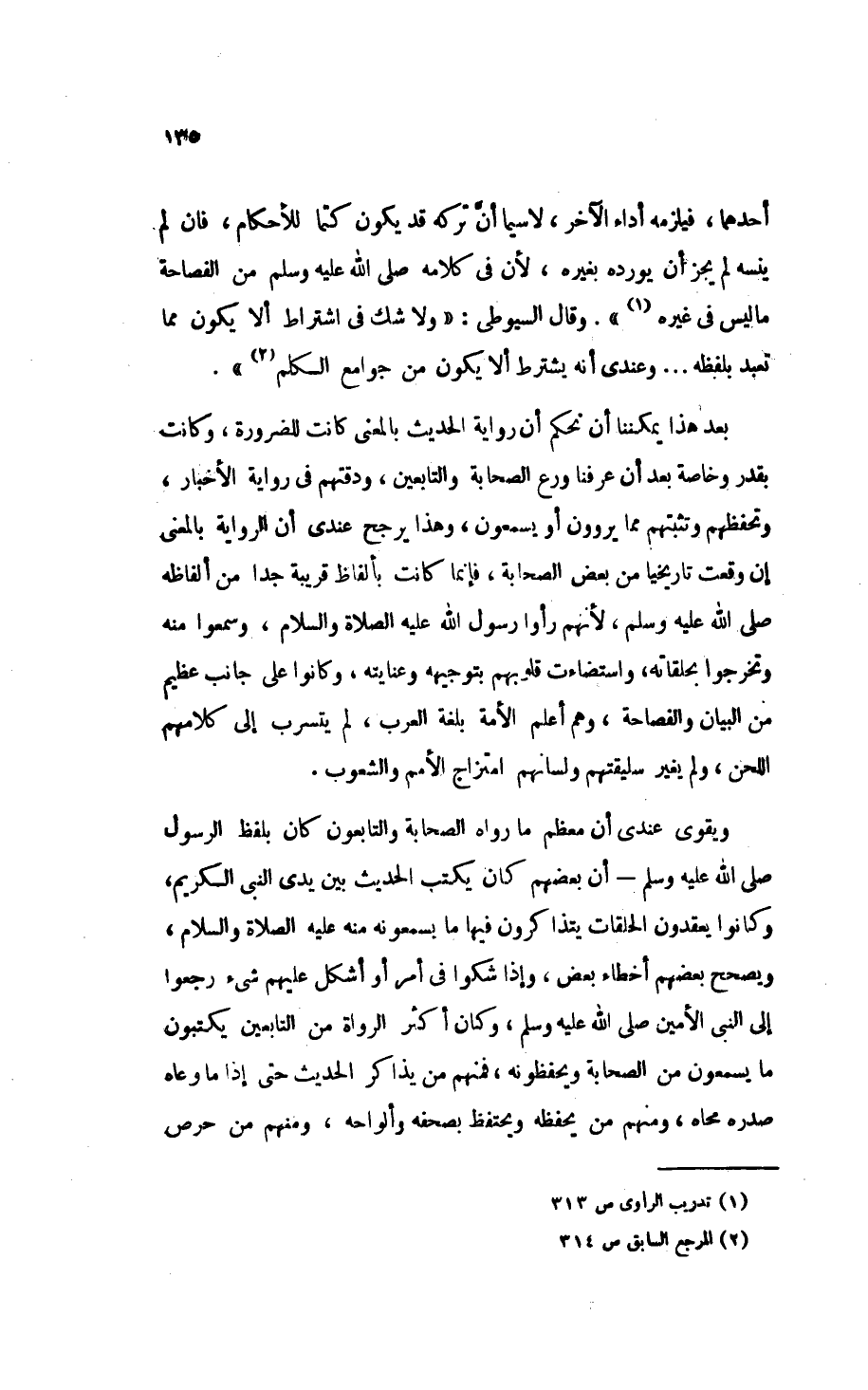 وَيُقَوِّي عندي أن معظم ما رواه الصحابة والتابعون كان بلفظ الرَّسُولِ - صَلََّى اللهُ عَلَيْهِ وَسَلَّمَ - أن بعضهم كان يكتب الحديث بين يدي النبي الكريم، وكانوا يعقدون الحلقات يتذاكرون فيها ما يسمعونه منه - عَلَيْهِ الصَلاَةُ وَالسَّلاَمُ -، ويصحح بعضهم أخطاء بعض، وإذا شكوا في أمر أو أشكل عليهم شيء رجعوا إلى النبي الأمين - صَلََّى اللهُ عَلَيْهِ وَسَلَّمَ -، وكان أكثر الرواة من التابعين يكتبون ما يسمعون من الصحابة ويحفظونه، فمنهم من يذاكر الحديث حتى إذا ما وعاه صدره محاه، ومنهم من يحفظه ويحتفظ بصحفه وألواحه، ومنهم من حرص