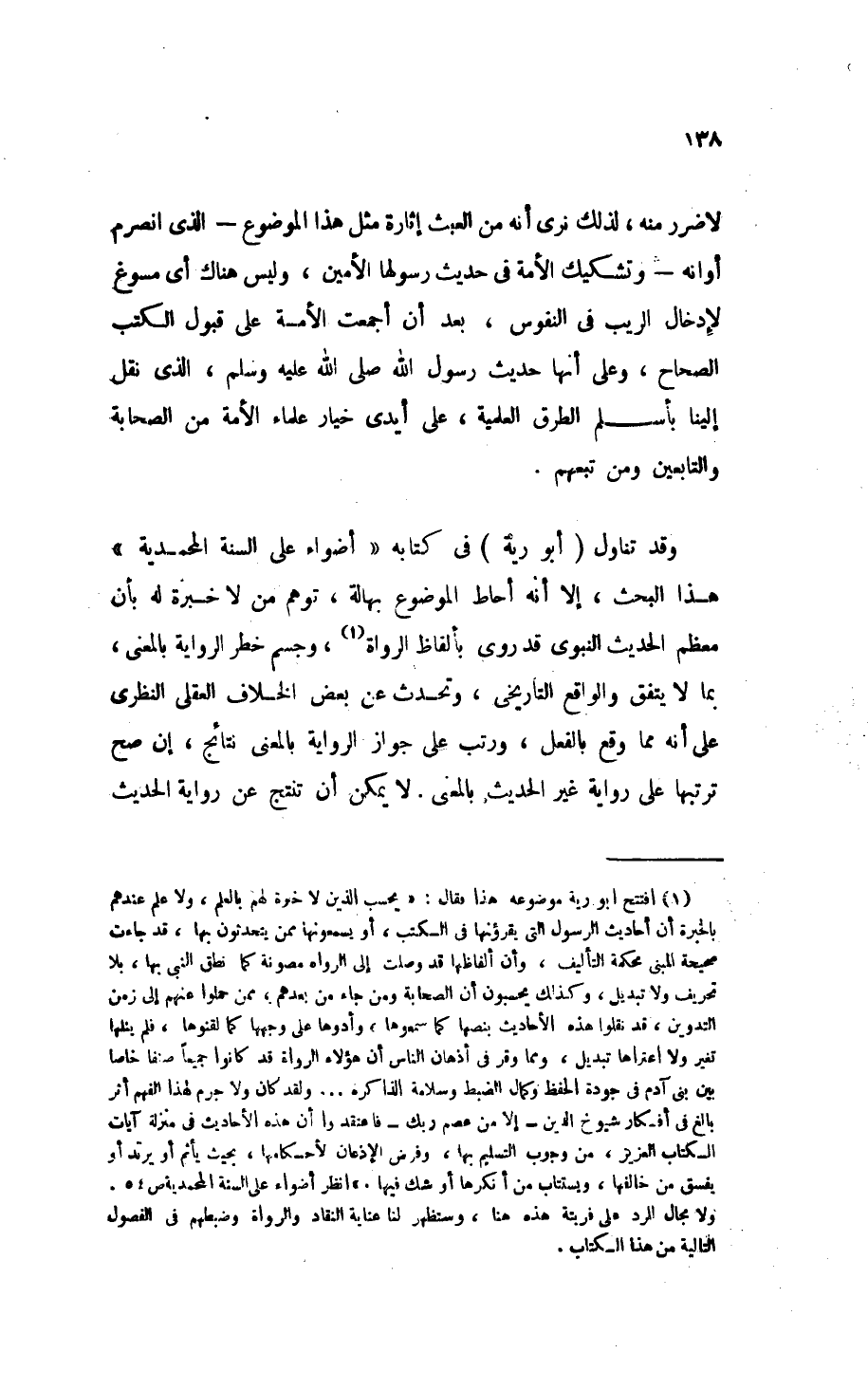 (¬1) افتتح أَبُو رَيَّةَ موضوعه فقال: «يحسب الذين لا خبرة لهم بالعلم، ولا علم عندهم بالخبرة أن أحاديث الرسول التي يقرؤنها في الكتب، أو يسمعونها ممن يتحدثون بها، قد جاءت صحيحة المبنى مُحْكَمَةَ التأليف، وأن ألفاظها قد وصلت إلى الرواة مصونة كما نطق النبي بها، بلا تحريف ولا تبديل، وكذلك يحسبون أن الصحابة ومن جاء بعدهم، ممن حملوا عنهم إلى زمن التدوين، قد نقلوا هذه الأحاديث بنصها كما سمعوها، وأدوها على وجهها كما لقنوها، فلم ينلها تغير ولا اعتراها تبديل، ومما وقر في أذهان الناس أن هؤلاء الرواة قد كانوا جَمِيعًا صِنْفًا خَاصًّا بين بني آدم في جودة الحفظ وكمال الضبط وسلامة الذاكرة ... ولقد كان ولا جرم لهذا الفهم أثر بالغ في أفكار شيوخ الدين - إلا من عصم ربك - فاعتقدوا أن هذه الأحاديث في منزلة آيات الكتاب العزيز، من وجوب التسليم بها، وفرض الإذعان لأحكامها، بحيث يأثم أو يَرْتَدُّ أو يفسق من خالفها، ويستتاب من أنكرها أو شك فيها». انظر " أضواء على السنة المحمدية ": ص 54. ولا مجال للرد على فريته هذه هنا، وستظهر لنا عناية النُقَّادِ والرواة وضبطهم في الفصول التالية من هذا الكتاب.
