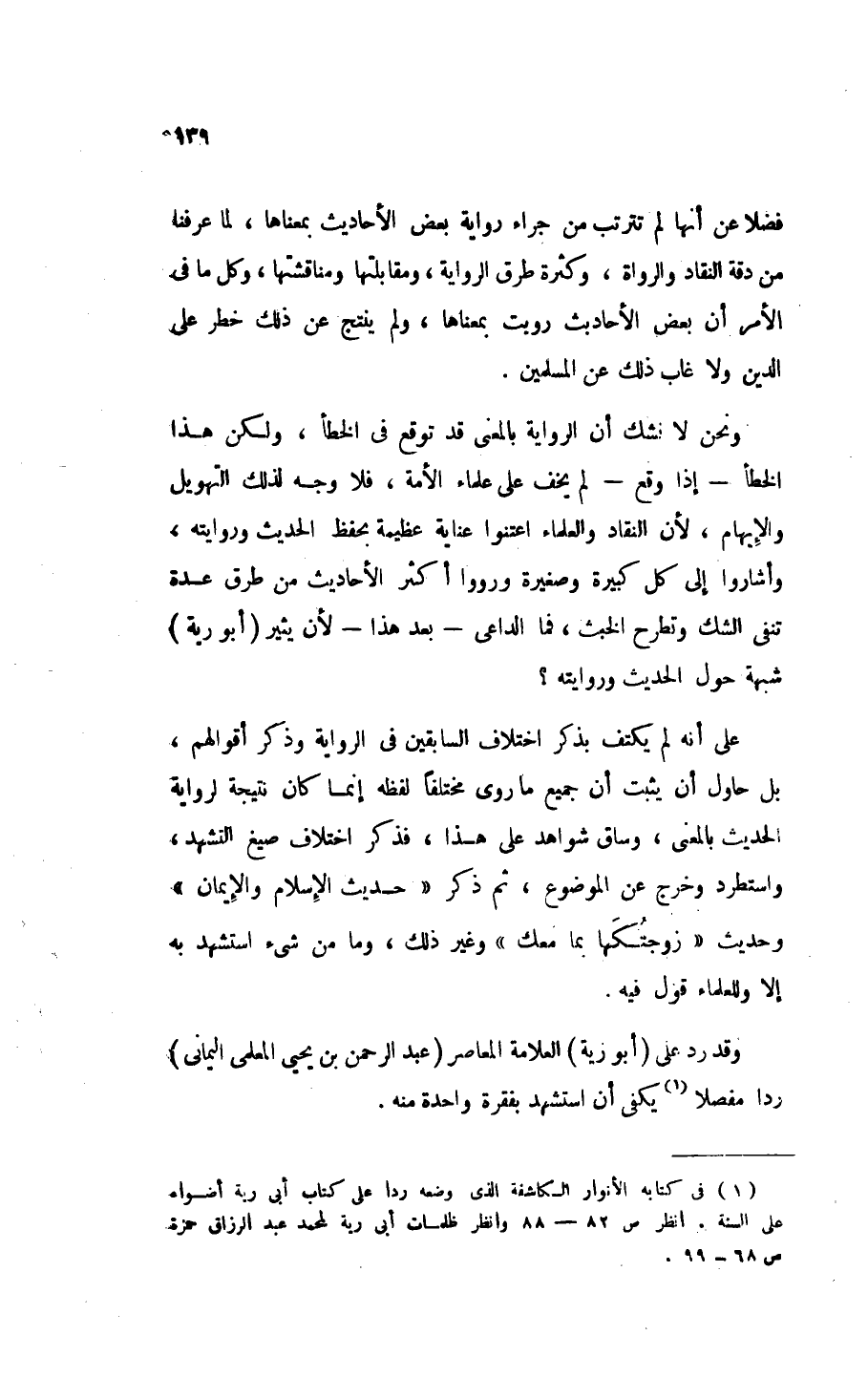 وقد رَدَّ على (أَبُو رَيَّةَ) العَلاَّمَة المعاصر (عبد الرحمن بن يحيى المُعَلَّمِي اليَمَانِي) رَدًّا مُفَصَّلاً (¬1) يكفي أن استشهد بفقرة واحدة منه.