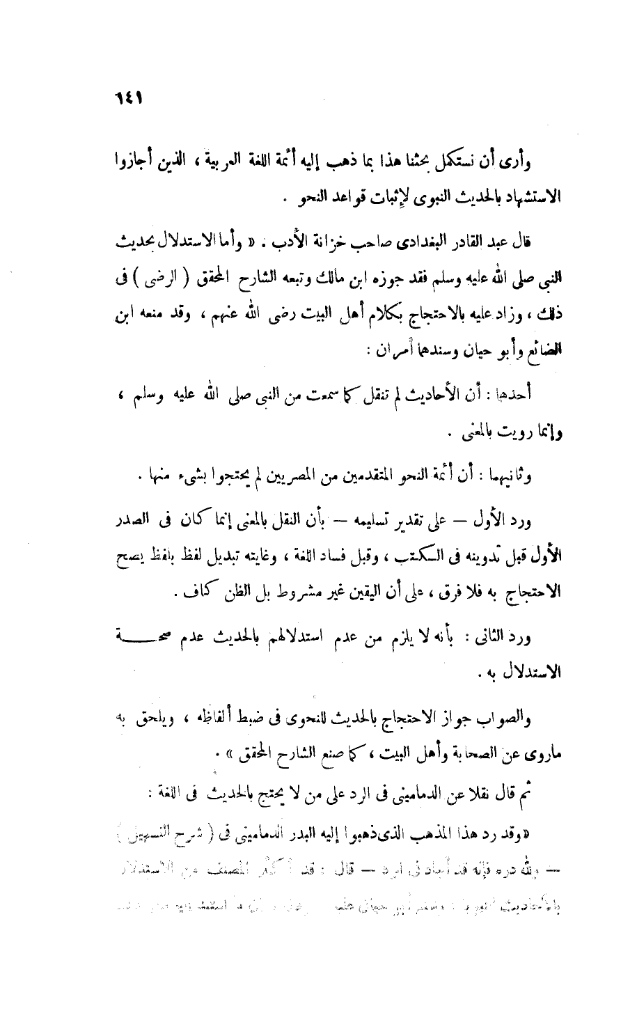 ثُمَّ قَالَ نَقْلاً عَنْ الدَّمَامِينِيِّ فِي الرَّدِّ عَلَى مَنْ لاَ يَحْتَجُّ بِالحَدِيثِ فِي اللُّغَةِ: «وَقَدْ رَدَّ هَذَا المَذْهَب الذِي ذَهَبُوا إِلَيْهِ البَدْرُ الدَّمَامِينِيِّ فِي " شَرْحِ التَّسْهِيلِ " - وَلِلَّهِ دَرُّهُ فَإِنَّهُ قَدْ أَجَادَ فِي الرَّدِّ - قَالَ: وَقَدْ أَكْثَرَ اَلْمُصَنَّفُ مِنْ الاسْتِدْلاَلِ بِالأَحَادِيثِ النَّبَوِيَّةِ وَشَنَّعَ أَبُو حَيَّان عَلَيْهِ , وَقَالَ: إِنَّ مَا اِسْتَنَدَ إِلَيْهِ مِنْ ذَلِك