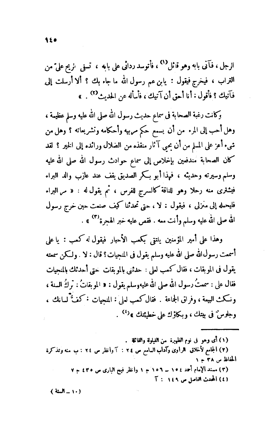 وكانت رغبة الصحابة في سماع حديث رَسُولِ اللهِ - صَلََّى اللهُ عَلَيْهِ وَسَلَّمَ - عظيمة، وهل أحب إلى المرء من أن يسمع حكم مُرَبِّيهِ وأحكامه وتشريعاته؟ وهل من شيء أعز على المسلم من أن يُحْيِي آثار منقذه من الضلال ورائده إلى الخير؟ لقد كان الصحابة مندفعين بإخلاص إلى سماع حوادث رَسُولِ اللهِ - صَلََّى اللهُ عَلَيْهِ وَسَلَّمَ - وسيرته وحديثه، فهذا أبو بكر الصِدِّيقُ يقف عند عازب والد البراء فيشتري منه رَحْلاً وهو للناقة كالسرج للفرس، ثم يقول له: «مُرْ البَرَاءَ فَلْيَحْمِلْهُ إِلَى مَنْزِلِي، فَقَالَ: لاَ، حَتَّى تُحَدِّثَنَا كَيْفَ صَنَعْتَ حِينَ خَرَجَ رَسُولُ اللهِ صَلَّى اللهُ عَلَيْهِ وَسَلَّمَ، وَأَنْتَ مَعَهُ؟»، فقص عليه خبر الهجرة (¬3).