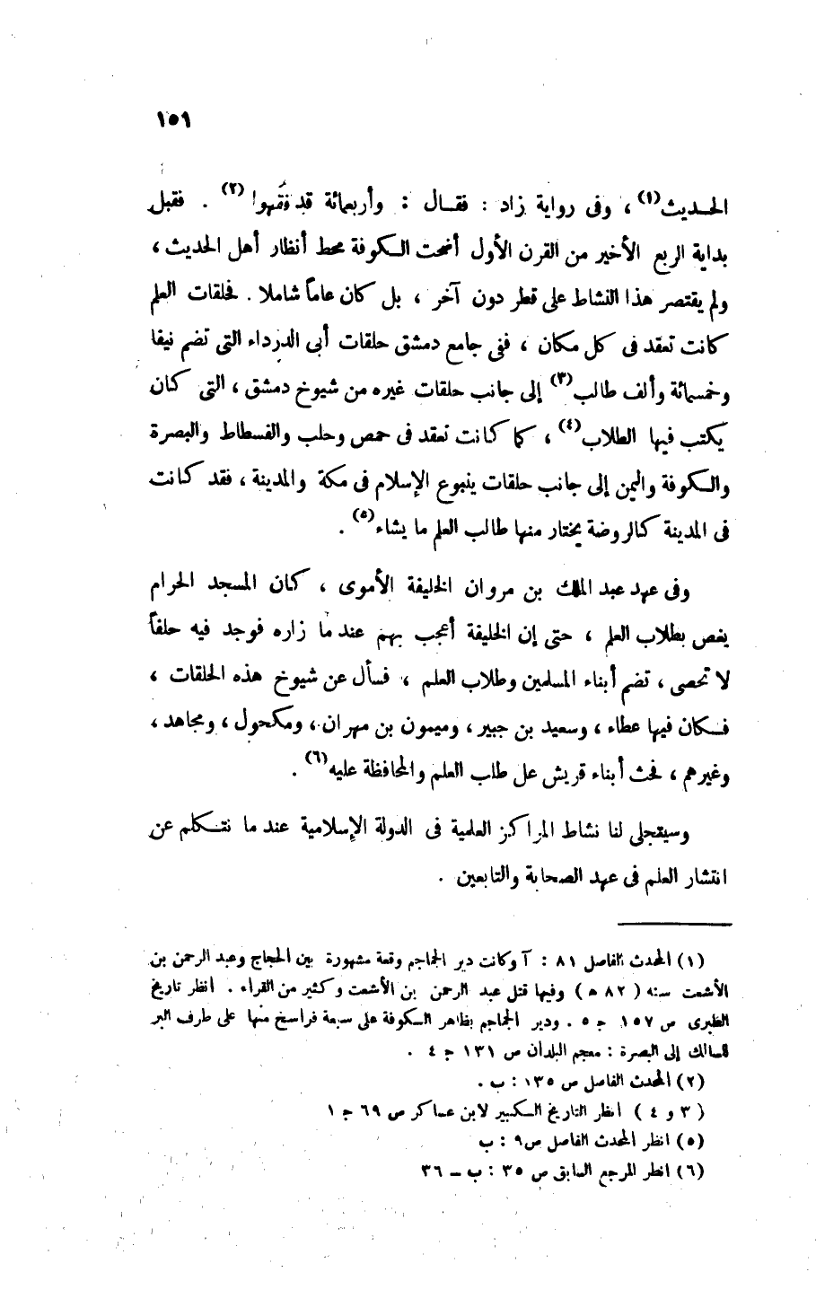 الحَدِيثَ» (¬1)، وفي رواية زاد: فقال: «وَأَرْبَعَمِائَةٍ قَدْ فَقِهُوا» (¬2). فَقَبْلَ بِدَايَةِ الربع الأخير من القرن الأول أضحت الكوفة محط أنظار أهل الحديث، ولم يقتصر هذا النشاط على قُطْرٍ دُونَ آخَرٍ، بل كان عَامًّا شاملاً. فحلقات العلم كانت تعقد في كل مكان، ففي جامع دمشق حلقات أبي الدرداء التي تضم نَيِّفًا وخمسمائة وألف طالب (¬3) إلى جانب حلقات غيره من شيوخ دمشق التي كان يكتب فيها الطلاب (¬4)، كما كانت تعقد في حمص وحلب والفسطاط والبصرة والكوفة واليمن إلى جانب حلقات ينبوع الإسلام في مكة والمدينة، فقد كانت في المدينة كالروضة يختار منها طالب العلم ما يشاء (¬5).