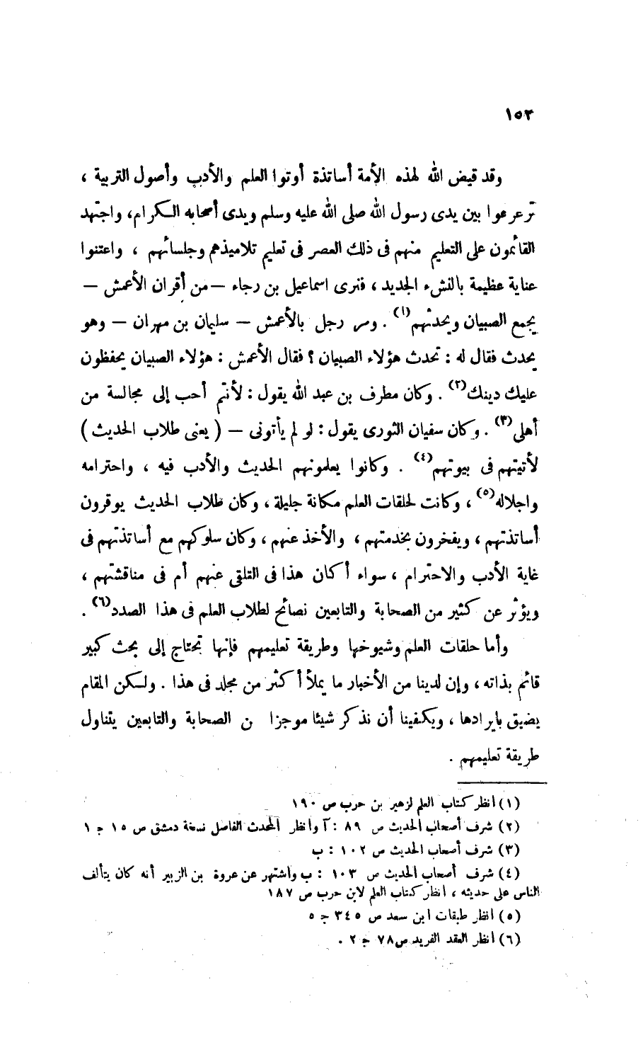وقد قَيَّضَ الله لهذه الأُمَّةِ أساتذة أوتوا العلم والأدب وأصول التربية ترعرعوا بين يدي رَسُولِ اللهِ - صَلََّى اللهُ عَلَيْهِ وَسَلَّمَ - ويدي أصحابه الكرام، واجتهد القائمون على التعليم منهم في ذلك العصر في تعليم تلاميذهم وجلسائهم، واعتنوا عناية عظيمة بالنشء الجديد، فنرى إسماعيل بن رجاء - من أقران الأعمش - «يَجْمَعُ الصِّبْيَانَ وَيُحَدِّثَهُمْ» (¬1) ومر رجل بالأعمش - سليمان بن مهران - وهو يحدث فقال له: تحدث هؤلاء الصبيان؟ فقال الأعمش: هؤلاء الصبيان يحفظون عليك دينك (¬2). وكان مُطَرَّفٌ بن عبد الله يقول: «لأَنْتُمْ أَحَبُّ إِلَيَّ مُجَالَسَةً مِنْ أَهْلِي» (¬3). وَكَانَ سُفْيَانُ الثَّوْرِيَّ، يَقُولُ: «لَوْ لَمْ يَأْتُونِي - (يعني طلاب الحديث) - لأَتَيْتُهُمْ فِي بُيُوتِهِمْ» (¬4). وكانوا يعلمونهم الحديث والأدب فيه، واحترامه وإجلاله (¬5)، وكانت لحلقات العلم مكانة جليلة، وكان طلاب الحديث يوقرون أساتذتهم، ويفخرون بخدمتهم، والأخذ عنهم، وكان سلوكهم مع أساتذتهم في غاية الأدب والاحترام، سواء أكان هذا في التلقي عنهم أم في مناقشتهم، ويؤثر عن كثير من الصحابة والتابعين نصائح لطلاب العلم في هذا الصدد (¬6).