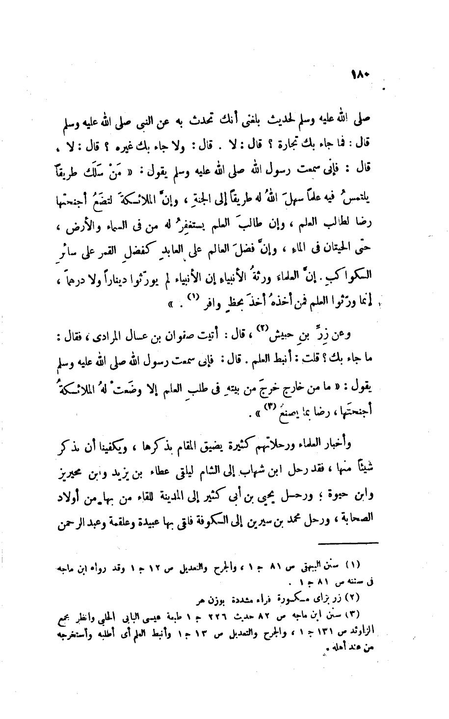 (¬3) " سنن ابن ماجه ": ص 82 حديث 226 جـ 1 طبعة عيسى البابي الحلبي، وانظر " مجمع الزوائد ": ص 131 جـ 1، و" الجرح والتعديل ": ص 13 جـ 1. و «أَنْبَطَ العِلْمَ»: أي طلبه واستخرجه من عند أهله.