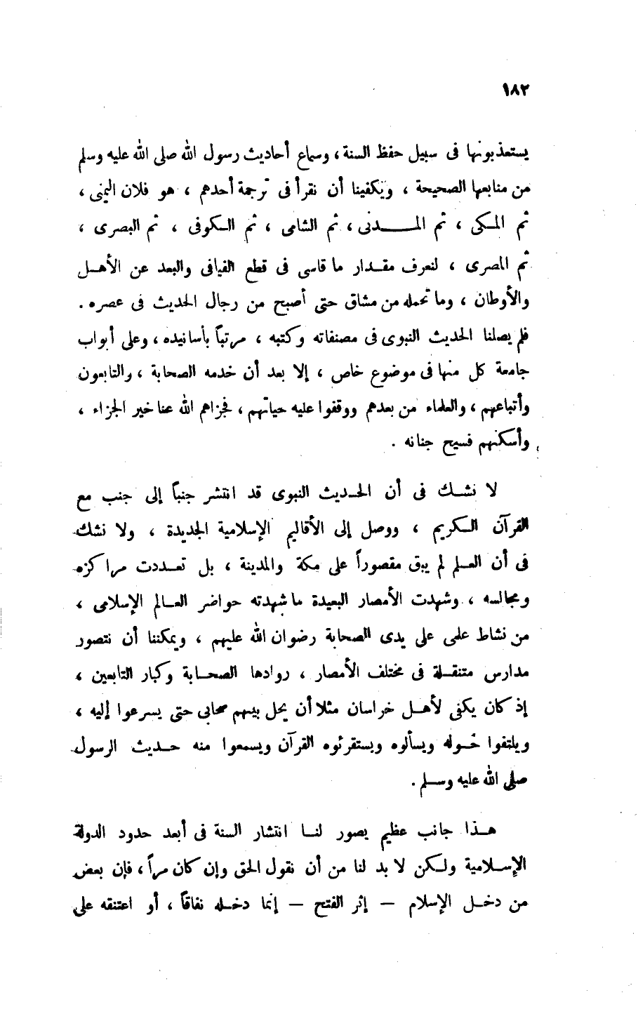 لا شك في أن الحديث النبوي قد انتشر جَنْبًا إِلَى جَنْبٍ مع القرآن الكريم، ووصل إلى الأقاليم الإسلامية الجديدة، ولا نشك في أن العلم لم يبق مقصورًا على مكة والمدينة، بل تعددت مراكزه ومجالسه، وشهدت الأمصار البعيدة ما شهدته حواضر العالم الإسلامي، من نشاط علمي على يدي الصحابة - رِضْوَانُ اللهِ عَلَيْهِمْ -، ويمكننا أن نتصور مدارس متنقلة في مختلف الأمصار، روادها الصحابة وكبار التابعين، إذ كان يكفي لأهل خراسان مثلاً أن يحل بينهم صحابي حتى يسرعوا إليه، ويلتفوا حوله ويسألوه ويستقرئوه القرآن ويسمعوا منه حديث الرسول - صَلََّى اللهُ عَلَيْهِ وَسَلَّمَ -.