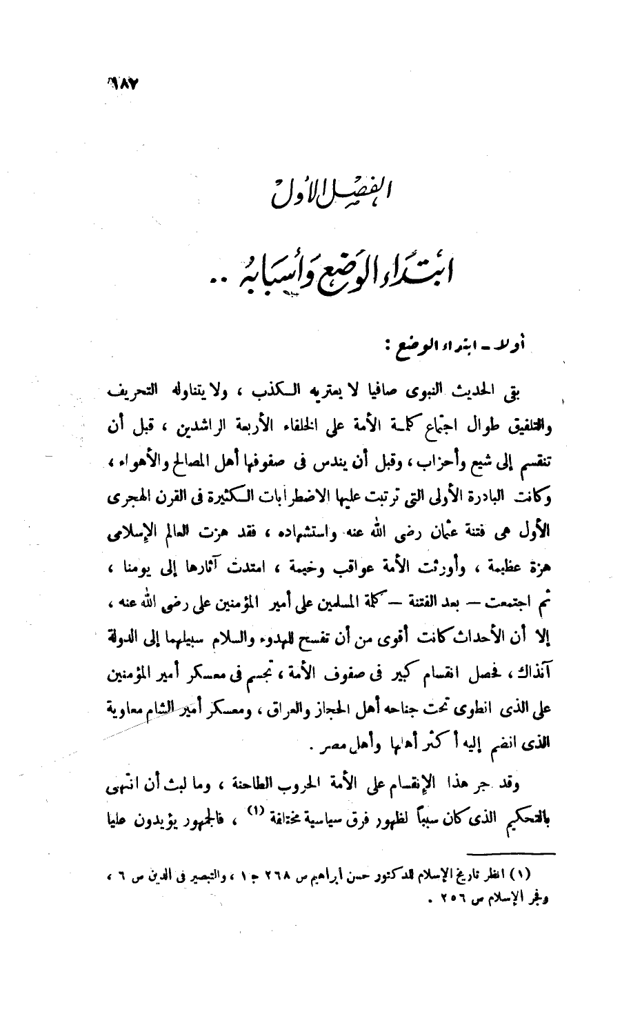 بقي الحديث النبوي صافيًا لا يعتريه الكذب، ولا يتناوله التحريف والتلفيق طول اجتماع كلمة الأمة على الخلفاء الأربعة الراشدين، قبل أن تنقسم إلى شيع وأحزاب، وقبل أن يندس في صفوفها أهل المصالح والأهواء وكانت المبادرة الأولى التي ترتبت عليها الاضطرابات الكثيرة في القرن الهجري الأول هي فتنة عثمان - رَضِيَ اللهُ عَنْهُ - واستشهاده، فقد هزت العالم الإسلامي هزة عظيمة، وأورثت الأمة عواقب وخيمة، امتدت آثارها إلى يومنا، ثم اجتمعت - بعد الفتنة - كلمة المسلمين على أمير المؤمنين عَلِيٌّ - رَضِيَ اللهُ عَنْهُ -، إلا أن الأحداث كانت أقوى من أن تفسح للهدوء والسلام سبيلهما إلى الدولة آنذاك، فحصل انقسام كبير في صفوف الأمة، تجسم في معسكر أمير المؤمنين عَلِيٌّ الذي انطوى تحت جناحه أهل الحجاز والعراق، ومعسكر أمير الشام معاوية الذي انضم إليه أكثر أهلها وأهل مصر.