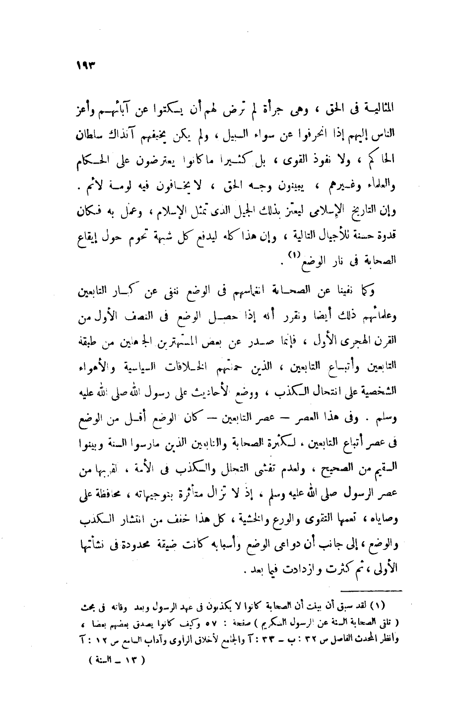 (¬1) لقد سبق أن بينت أن الصحابة كانوا لا يكذبون في عهد الرسول وبعد وفاته في بحث (تلقي الصحابة السنة عن الرسول الكريم) صفحة: 57 وكيف كانوا يصدق بعضهم بعضًا، وانظر " المحدث الفاصل ": ص 23: ب - 33: آ. و" الجامع لأخلاق الراوي وآداب السامع ": ص 12: آ.
