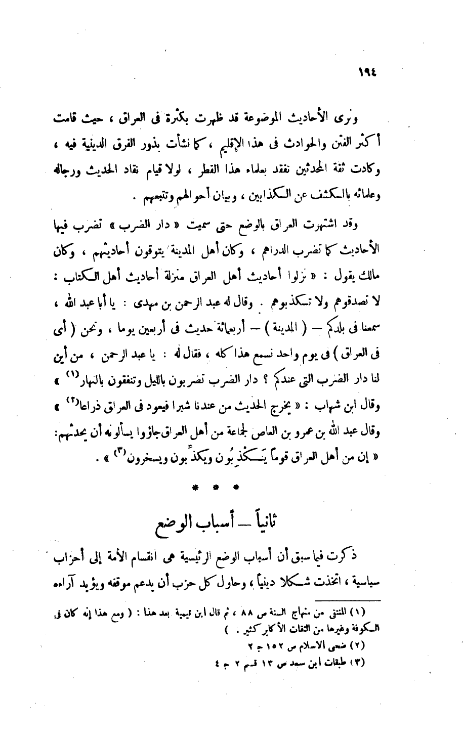 ونرى الأحاديث الموضوعة قد ظهرت بكثرة في العراق، حيث قامت أكثر الفتن والحوادث في هذا الإقليم، كما نشأت بذور الفرق الدينية فيه، وكادت ثقة المحدثين تفقد بعلماء هذا القطر، لولا قيام نقاد الحديث ورجاله وعلمائه بالكشف عن الكذابين، وبيان أحوالهم وتتبعهم.