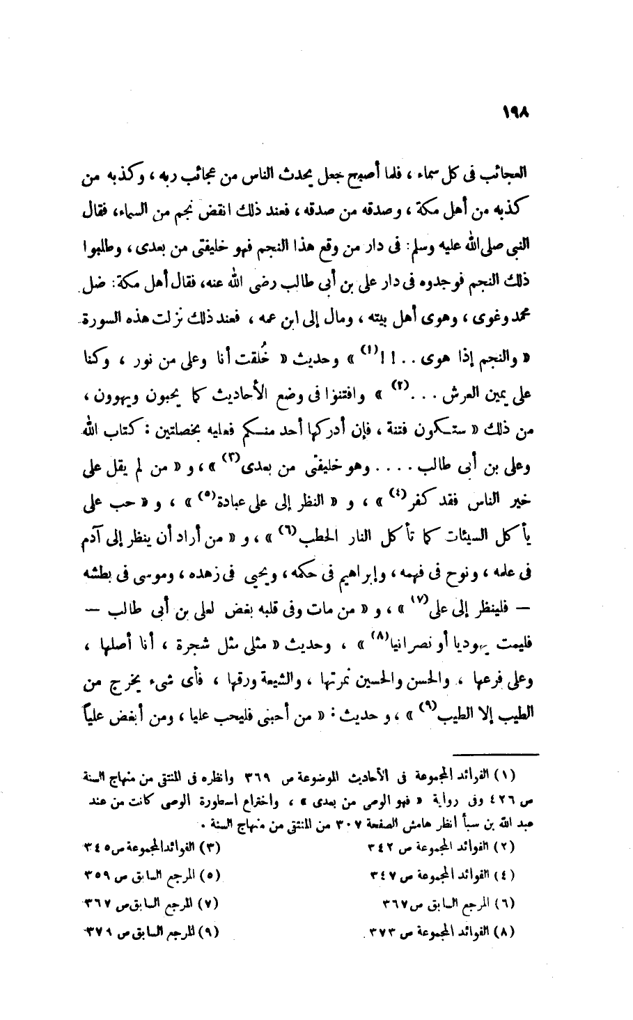 العَجَائِبَ فِي كُلِّ سَمَاءٍ. فَلَمَّا أَصْبَحَ جَعَلَ يُحَدِّثُ النَّاسَ مِنْ عَجَائِبِ رَبِّهِ، وَكَذَّبَهُ مَنْ كَذَّبَهُ مَنْ أَهْلِ مَكَّةَ، وَصَدَّقَهُ مَنْ صَدَّقَهُ، فَعِنْدَ ذَلِكَ انْقَضَّ نَجْمٌ مِنَ السَّمَاءِ، فَقَالَ النَّبِيُّ صَلَّى اللَّهُ عَلَيْهِ وَآلِهِ وَسَلَّمَ: " فِي دَارِ مَنْ وَقَعَ هَذَا النَّجْمُ فَهُوَ خَلِيفَتِي مِنْ بَعْدِي"، وَطَلَبُوا ذَلِكَ النَّجْمَ فَوَجَدُوهُ فِي دَارِ علي بن أبي طالب - رَضِيَ اللهُ عَنْهُ -، فَقَالَ أَهْلُ مَكَّةَ: ضَلَّ مُحَمَّدٌ وَغَوَى وَهَوَى أَهْلَ بَيْتِهِ، وَمَالَ إِلَى ابْنِ عَمِّهِ، فَعِنْدَ ذَلِكَ نَزَلَتْ هَذِهِ السُّورَةُ {وَالنَّجْمِ إِذَا هَوَى} (¬1)، وحديث: «خَلَقْتُ أَنَا وَعَلِيٌّ مِنْ نُورٍ، وكنا عَلَى يَمِينِ العَرْشِ ... » (¬2) وافتنوا في وضع الأحاديث كما يحبون ويهوون، من ذلك: «سَتَكُونُ فِتْنَةٌ، فَإِنْ أَدْرَكَهَا أَحَدٌ مِنْكُمْ فَعَلَيْهِ بِخَصْلَتَيْنِ: كِتَابِ اللَّهِ، وَعَلِيِّ بْنِ أَبِي طَالِبٍ ... وَهُوَ خَلِيفَتِي مِنْ بَعْدِي» (¬3) و «مَنْ لَمْ يَقُلْ: عَلِيٌّ خَيْرُ النَّاسِ، فَقَدْ كَفَرَ» (¬4)، و «النَّظَرُ إِلَى عَلِيٍّ عِبَادَةٌ» (¬5)، و «حُبُّ عَلِيٍّ يَأْكُلُ السَّيِّئَاتِ كَمَا تَأْكُلُ النَّارُ الحَطَبَ» (¬6)، و «مَنْ أَرَادَ أَنْ يَنْظُرَ إِلَى آدَمَ فِي عِلْمِهِ، وَنُوحٍ فِي فَهْمِهِ، وَإِبْرَاهِيمَ فِي حُكْمِهِ، وَيَحْيَى فِي زُهْدِهِ، وَمُوسَى فِي بَطْشِهِ، فَلْيَنْظُرْ إِلَى عَلِيٍّ» (¬7)، و «مَنْ مَاتَ وَفِي قَلْبِهِ بُغْضٌ لِعَلِيِّ بْنِ أَبِي طَالِبٍ، فَلْيَمُتْ يَهُودِيًّا أَوْ نَصْرَانِيًّا» (¬8)، وحديث: «مَثَلِي مَثَلُ شَجَرَةٍ، أَنَا أَصْلُهَا، وَعَلِيٌّ فَرْعُهَا، وَالحَسَنُ وَالحُسَيْنُ ثَمَرَتُهَا، وَالشِّيعَةُ وَرَقُهَا. فَأَيُّ شَيْءٍ يَخْرُجُ مِنَ الطِّيبِ إِلاَّ الطَيِّبَ» (¬9)، وحديث: «مَنْ أَحَبَّنِي فَلْيُحِبَّ عَلِيًّا، وَمَنْ أَبْغَضَ عَلِيًّا
