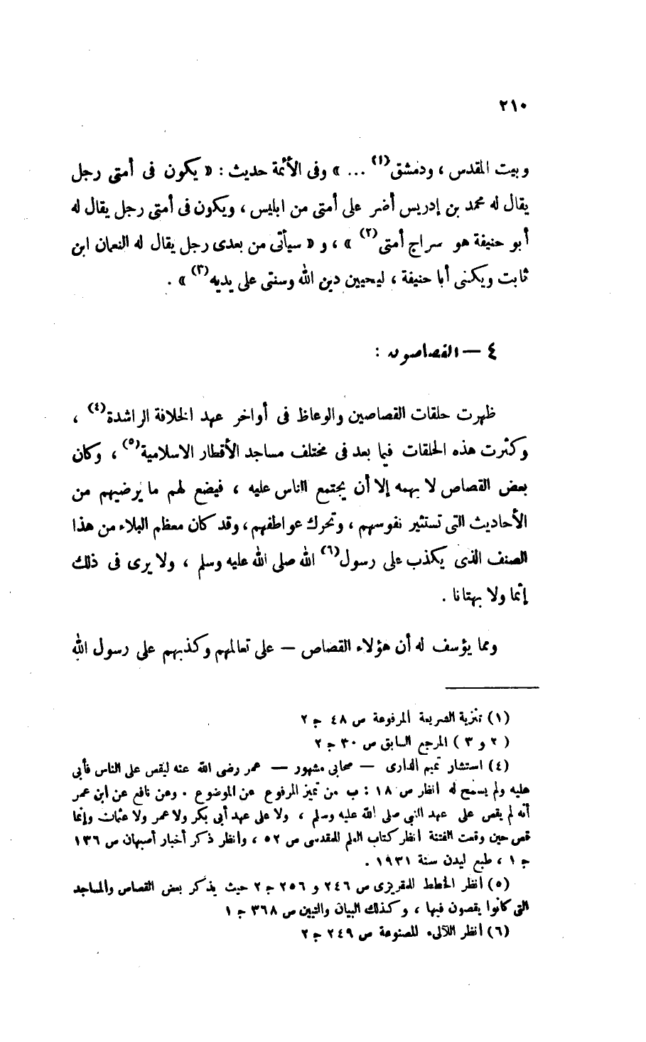(¬4) استشار تميم الداري - صحابي مشهور - عمر - رَضِيَ اللهُ عَنْهُ - ليقص على الناس فأبي عليه ولم يسمح له. انظر ص 18: ب من " تمييز المرفوع عن الموضوع ". وعن نافع عن ابن عمر أنه لم يقص على عهد النبي - صَلَّى اللهُ عَلَيْهِ وَسَلَّمَ -، ولا على عهد أبي بكر ولا عمر ولا عثمان وإنما قص حين وقعت الفتنة. انظر كتاب " العلم " للمقدسي: ص 52، وانظر " ذكر أخبار أصبهان ": ص 136 جـ 1، طبع ليدن سنة 1931.