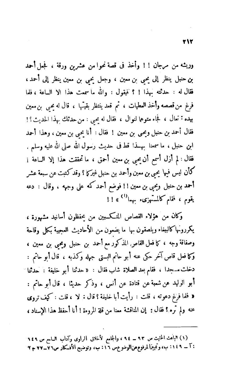 وَرِيشُهُ مِنْ مَرْجَانَ!!» وَأَخَذَ فِي قِصَّةٍ نَحْوًا مِنْ عِشْرِينَ وَرَقَةً. فَجَعَلَ أَحْمَدُ بْنُ حَنْبَلٍ يَنْظُرُ إِلَى يَحْيَى بْنَ مَعِينٍ، وَجَعَلَ يحيى بْنَ مَعِينٍ ينظر إِلَى أَحْمد. فَقَالَ لَهُ: «حَدَّثْتَهُ بِهَذَا!؟» فَيَقُولُ: «وَاللَّهِ مَا سَمِعْتُ بِهَذَا إِلاَّ السَّاعَةَ»، فلما فرغ من قصصه وأخذ العطيات، ثم قعد ينتظر بقيتها، قال له يحيى بن معين بيده: تعال، فجاء متوهمًا لنوال، فَقَالَ لَهُ يَحْيَى: «مَنْ حَدَّثَكَ بِهَذَا الحَدِيثِ؟!» فَقَالَ: «أَحْمَدُ بْنُ حَنْبَلٍ وَيَحْيَى بْنُ مَعِينٍ». فَقَالَ: «أَنَا يَحْيَى بْنُ مَعِينٍ، وَهَذَا أَحْمَدُ بْنُ حَنْبَلٍ. مَا سَمِعْنَا بِهَذَا قَطُّ فِي حَدِيث رَسُول الله - صَلََّى اللهُ عَلَيْهِ وَسَلَّمَ -!. فَقَالَ: «لَمْ أَزَلْ أَسْمَعُ أَنَّ يَحْيَى بْنَ مَعِينٍ أَحْمَقٌ، مَا تَحَقَّقْتُ هَذَا إِلاَّ السَّاعَةَ! ... كَأَنْ لَيْسَ فِي الدُّنْيَا يَحْيَى بْنُ مَعِينٍ وَأَحْمَدُ ابْن حَنْبَلٍ غَيْرُكُمَا؟. قَدْ كَتَبْتُ عَنْ سَبْعَةَ عَشَرَ أَحْمَدَ بْنَ حَنْبَلٍ وَيَحْيَى بْنَ مَعِينٍ!!» فوضع أحمد كمه على وجهه، وقال: «دَعْهُ يَقُومُ»، فقام كالمستهزئ بهما» (¬1)!!.